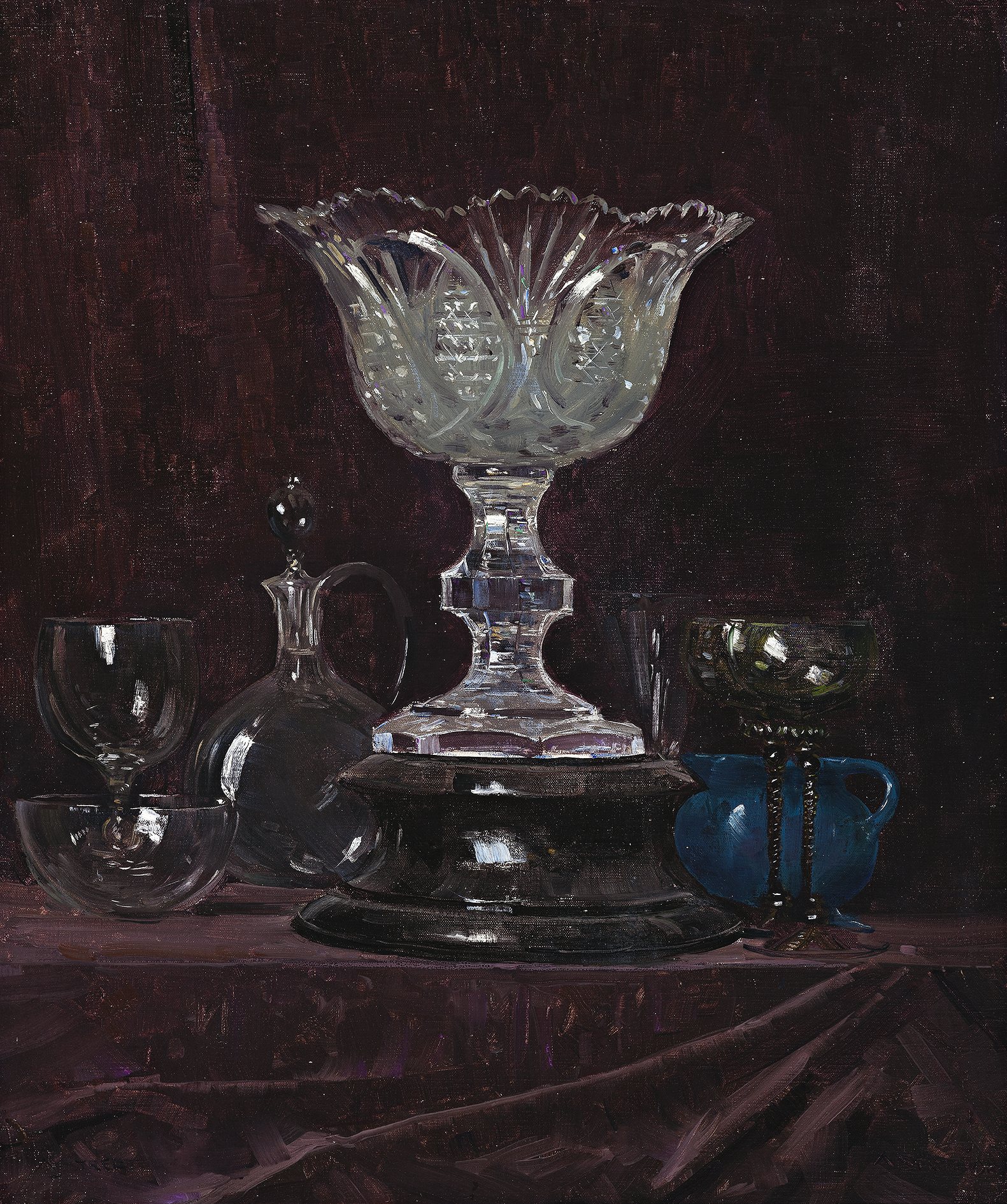 Light is central to Arthur Streeton’s art. From Golden Summer, Eaglemont, 1889 (National Gallery of Australia, Canberra), through its subtle play in ‘Still glides the stream, and shall forever glide’, 1890 (Art Gallery of New South Wales, Sydney), to the grandeur of ‘The purple noon’s transparent might’, 1896 (National Gallery of Victoria, Melbourne), Streeton evokes the ineffable through his use of light, giving the magic of poetry to all that it touches. The waters of Sydney Harbour and the Grand Canal in Venice gave him further opportunities to display his mastery of the sparkle of sunlight. In Glass, 1929 we have another, extraordinary in the way it brings such eye-catching movement into a ‘still’ life. Common as glass may be, it still possesses a contradictory brilliance, a strength in its beauty that belies its frailty. Streeton conjures this up in a painterly conversation of intriguing shapes and tactile surfaces. The smooth elegance of the vase, decanter, wine glasses and bowls is contrasted with the velvet feel and folds of the material covering the table on which they stand. Glass reveals him to be a master of the tactile.