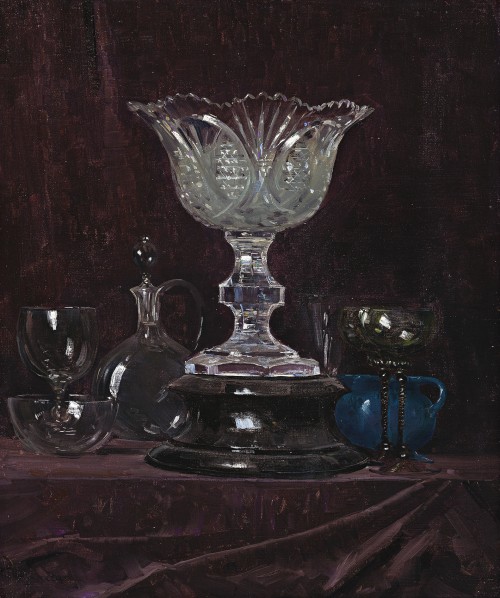 Seemingly unique in Streeton’s oeuvre as a subject in its own right, Glass was shown in his 1931 exhibition at the Fine Art Society’s Gallery, Melbourne. It was surrounded by landscapes of the Murray, Kosciusko, Olinda, and flower paintings of roses and tulips. While praising Streeton’s ‘unerring vision and sense of colour and atmosphere’ in his landscapes, Harold Herbert, then art critic for the Melbourne Argus newspaper, turned to the flower pieces. In describing ‘many of them bunched in a bowl of cut crystal’, Herbert took into his account the glass as an object of admiration. ‘The bowl itself is an object lesson in still-life painting, [he wrote] but the flowers have a quality which almost enables them to be felt and touched.’1 That same sense of the tangible permeates Glass, the darkened background providing the perfect foil for the sparkle of light, highlighting the cut of the crystal and the roundness of bowl and decanter in its convincing illusion of form. As if to counter the limitation of colour, Streeton added the bright blue jug to the right, as if to lead the eye into discovering the colour subtleties in the other pieces. While his paintings of flowers in their crystal vases have the added attraction of enticement of the senses through their imagined perfumes, his concentration on glass alone weaves its own magic. One cannot, nor wants to, escape its entrancing sparkle.
