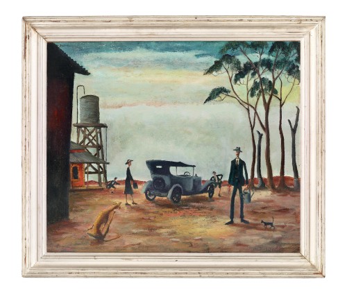Going to the Pictures, 1941 was purchased soon after the exhibition by Clive Turnbull, journalist, author, poet and critic. A highly respected writer, he worked on the Argus newspaper before joining the Melbourne Herald in 1932. Appointed to the role of art critic in 1942, his keen interest and knowledge about contemporary art was such that the newspaper’s chief, Sir Keith Murdoch, consulted Turnbull regarding his own art purchases.13 Turnbull’s selection of this painting suggests a fine sense of humour as well as a very good eye. Despite the rigours of life in such a setting, where dusty earth and a vast bleached sky dominate the view, the family is dressed for their outing in their Sunday best. Spindly trees echo the exaggerated form of the father’s limbs, while the dog in the foreground, contorting to scratch its neck, mirrors the awkward angularity of the playing boys. Water is clearly scarce, and Drysdale’s focus on the galvanised iron tank raised on its timber stand and the watering can – which has presumably just been used to fill the car’s radiator – emphasises its importance. While there is humour here, and Drysdale’s characteristically expressive handling of paint, there is also great empathy. Reflecting aspects of both what Drysdale saw and what he felt 14, these images are also what Geoffrey Dutton insightfully deemed ‘spiritual records’ of Australia.15