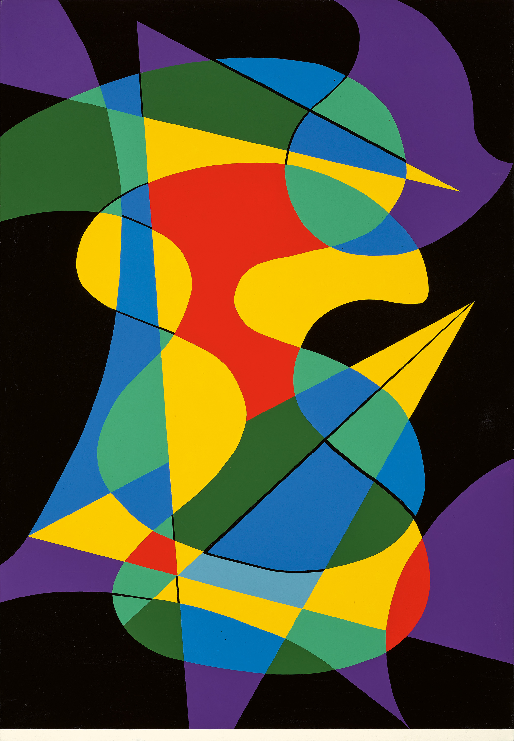 When Gone Bio–Bio Too was exhibited at the Joan and Peter Clemenger Triennial Exhibition of Contemporary Australian Art in 1993, Rooney offered the briefest of statements, recalling his early interest in abstraction, cubism and surrealists such as Jean Arp and Joan Miró, ‘…also take on associations with my hard-edge serial/cereal abstractions of the late 1960s. Other associations will have to be worked out by the viewer.’6 The reference to biomorphic abstraction is unmistakable, especially Miró where organic bulbous shapes are divided by two contrasting colours and black lineal definitions play across the surface.7 Rooney often used imagery he had gathered from childhood onwards, with the flatness of children’s book illustrations and comics coming to mind. An all-over controlled randomness is evocative of sixties design – sweeps, arcs, and geometric shapes that float are held in space, intersected and lock together. He trained as a commercial designer – a modernist style of his generation that remained with him.