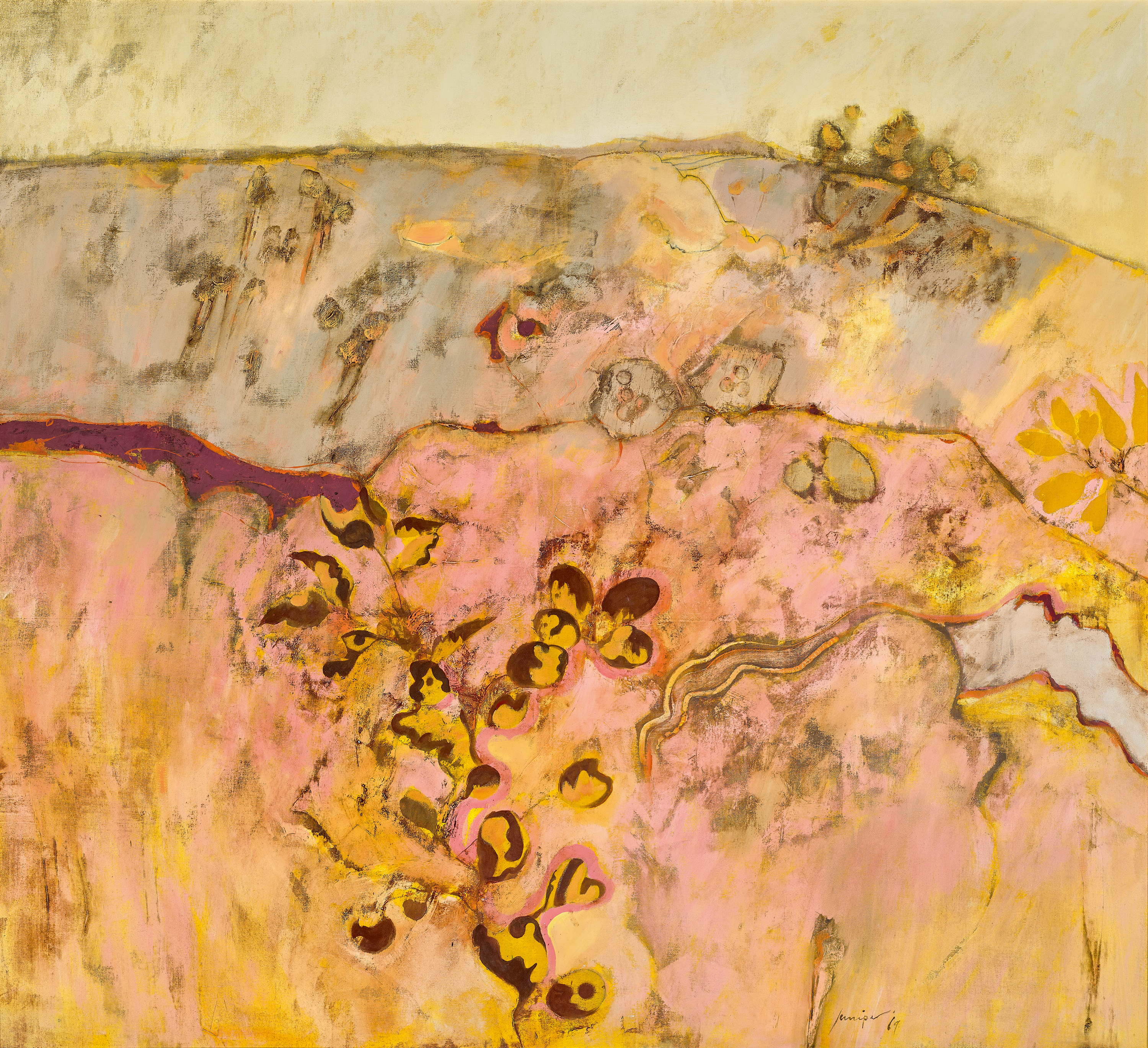 Juniper found success early in his career by winning the inaugural Perth Prize for Contemporary Art in 1954, and through his inclusion in the landmark London exhibition Recent Australian painting at the Whitechapel Gallery in 1961. He was also taken under the wing of the charismatic Perth gallerist Rose Skinner whose eponymous business attracted the cream of Australian artists such as Nolan, Boyd, Drysdale and Olsen, all of whom Juniper socialised with through his patron’s largesse. He also assisted in hanging exhibitions at the gallery which enabled him to intimately study individual artist’s techniques, particularly Fred Williams, whose example became an important early influence. In 1964, Skinner organised a solo exhibition for her protégé in Tokyo and whilst he was unable to accompany that show, Juniper travelled to Japan later in 1967, staying for an extended period absorbing the country’s art. By this time, the artist had already developed an individualistic approach to his painting, using canvas stretched flat on a work bench and primed with a home-made gesso applied using a spatula, a process which allowed Juniper to model surface textures as he went. These were further enhanced with nicks and incisions before drying, after which acrylic paint was applied to pre-moistened areas, allowing it to run and spill like watercolour. After sealing with PVA, he then utilised oil paints embellished and thickened with textural additives.2 Following his experiences in Japan, the overlaying details added to his paintings became more elegant, even decorative, particularly when depicting plants, and this is particularly evident when comparing two versions of the same subject, Greenmount Hill, 1967, and the example on offer here, painted two years later. In both cases, they explicitly confront Juniper’s notion that having experienced the ‘orderly, worked-over Japanese landscape [he now] “longed for a bit of scruffy, dandruffy Australian bush. I’d stepped away from Australia and then suddenly saw the Australian landscape for its own unique beauty.”’3