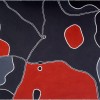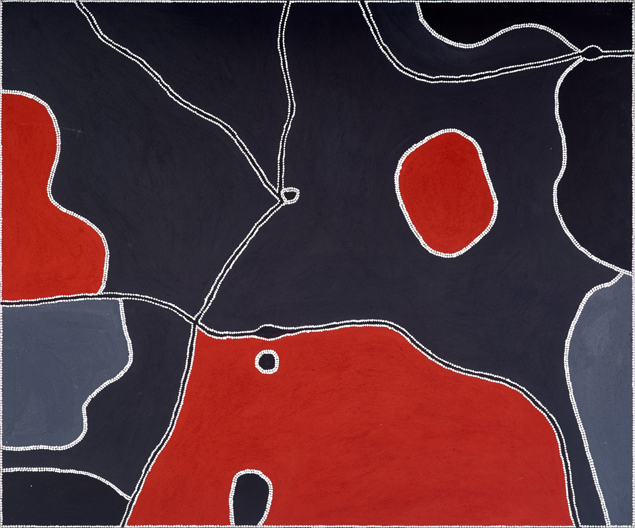 This work is accompanied by a certificate of authenticity from Jirrawun Arts, Kununurra which states: ‘The V-shaped section at the top left represents roads meeting at Greenvale Station, shown as the small black circle right at the junction. Freddie Timms spent part of his childhood at Greenvale. Moat Creek stockyard is shown as the black circle located below the waterhole on Greenvale River seen flowing across the painting from centre left to the bottom right hand corner. Kurrajong Creek runs from the top of the painting across to the right-hand side and Kurrajong waterhole can be seen on the edge of the ranges – the two black shapes on either side. The black and red planes at the centre of the painting represent flat country which is mixed red and black soil plains – ‘bulldust country’ as Freddie calls it. The large red ‘circle’ at upper right centre represents a little hill. The black shape projecting into the painting from the lower edge is ‘one big rock’. The black, red and grey sections surrounding the painting on both left and right sides are rocky places – hills.’
