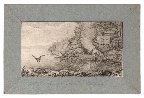 A bucolic scene of life on the shores of Port Jackson with figures fishing and cooking. For the era this is a tremendously important scene, and further evidence that the French genuinely sought out the Sydney Aboriginal people in their traditional ways of life and did not, like many of their English compatriots almost 15 years after the First Fleet, content themselves with depictions of Aboriginal men and women in the township of Sydney proper. This offers a snapshot of a still vibrant culture that existed on the very edges of settlement.