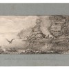 Although the relationship between this original sketch and the finished plate is very close, it is equally obvious that there are several important differences which make the finished version less lively, notably in the depiction of the human figures that populate the scene which have become in the engraving more lumpen (particularly in terms of the group at the fire and the family arriving at left). Lesueur’s depiction of the towering sandstone of the headland is particularly naturalistic, making it appear much more correctly weathered and less “blocky” than the finished engraving.