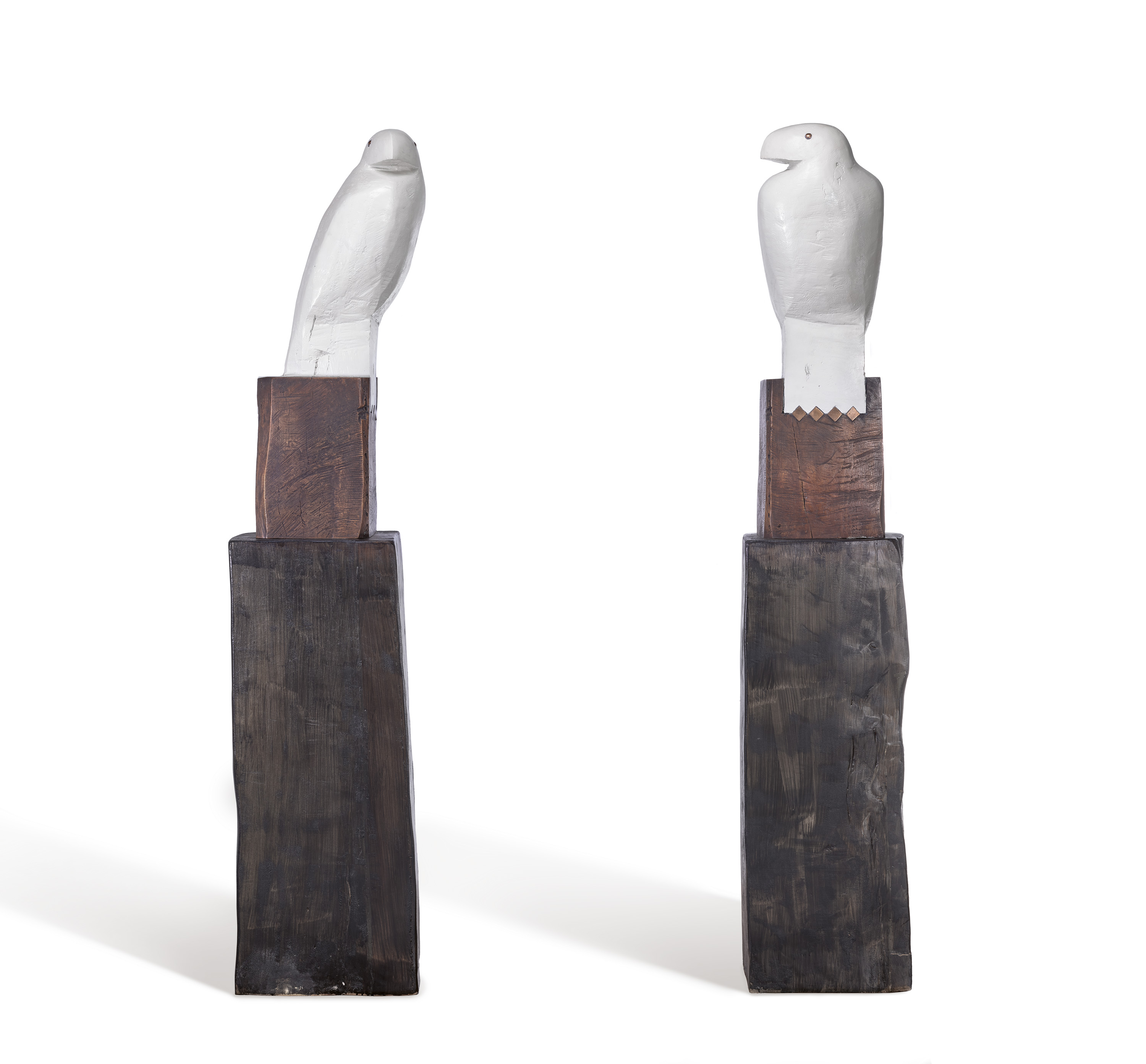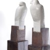 Placed upon robust plinths replicating rustic wooden beams, and gleaming with a simple tonal contrast and subtle polished metal details, these Guardians, 2009 – 2021 are editioned bronzes, recreating in a domestic scale the imposing and memorable format of Armstrong’s Guardians at the Russell Street entrance of Melbourne’s Hyatt Hotel. They are turned with heads cocked in static and silent dialogue, omniscient and ever watchful. Painted a uniform white with pigments mixed with marine acrylic (a defensive weather patina), the Guardians stand proud with a striking silhouette. Their smoothed simplified shapes embody the Wedge-Tailed Eagle, Australia’s largest bird of prey and a significant figure in local Indigenous mythology.