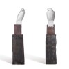 Bruce Armstrong, a self-confessed twitcher and having idealised himself as a falconer within a 2005 self-portrait3, writes: ‘Bird’s are everyone’s allegory, a totem for all personalities. Every culture has bird stories… one can sift through the history of art and find images of birds in the earliest of humanity’s imagery.’4 His oeuvre is peppered with avian forms, most devoid of detail and adopting a symbolic shape of varying simplification. Some resting, others using their outspread wings as protective, encircling shields. Based on an early maquette from 1996, the docklands Bunjil had prominent, defined legs and talons gripping the plinth behind which fell his folded wings and tail. This present pair of Guardians, based on a later design, features a simpler form which smooths the eagle’s turned head, body and legs into one even and uniform plane. Unlike the public monumental versions, their talons are symbolically chiselled into the base in a chevron pattern, inlaid with gleaming bronze diamonds.