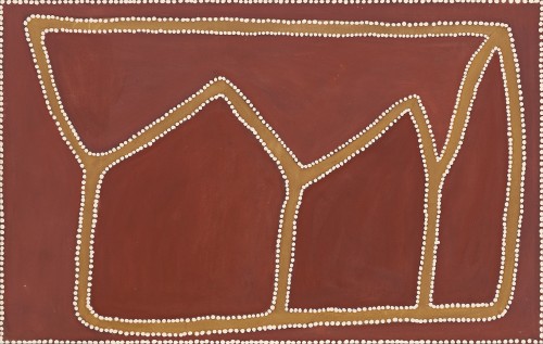 Painted in the year before Rover Thomas, along with Trevor Nickolls, became the first Aboriginal artists to represent Australia at the Venice Biennale, Guwaliwali, 1989 presents a plan view of the east Kimberley landscape where lines indicate paths travelled, tracks and roads, or delineate geographic features and circumscribe discreet areas of country. Characteristic of the Rover’s paintings, the conjunction of dotted lines simultaneously suggest a profile view, as though one were standing on the red-ochred earth looking at a distant hilly range.