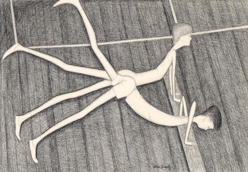 'The series of gymnasts consists of ten oil paintings and eight conte drawings. Thematically it presents a logical progression from the ballroom dancing series – the concern with senseless ritual as recreational activities are converted into difficult and testing labour. In its formal language, however, there are signs of a fundamental change. A constant preoccupation in Brack's art is identity. This can be traced back to a youthful interest in books on physiognomy as well as a later study of Nigel Dennis' Cards of Identity with its questions of 're-identification' and 'personal distinctiveness' ... Up to this point, Brack's images of still-life objects - scissors, knives and forks - were kept separate from figure compositions, although he did imbue these still life objects with a symbolic existence. In the gymnast series, the stick-like figures start to lose a little of their human identity and increasingly become formal elements that symbolically convey humanity as observed from a distance. The whole setting is reduced to a minimum - the featureless floors and walls of the gymnasium, with a few lines on the bare floorboards marking off the extent of the playing arena. They are very sparse compositions where the figures remain the dominant elements but no longer occupy most of the picture space.