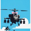 Banksy, who although like a latter-day Robin Hood remains officially anonymous, is a street artist who has become household name around the world, with a reach far beyond the Bristol underground scene from which he emerged in the early 1990s. His stencilled compositions use visual metaphors to illustrate the corruption of innocence by war, environmental degradation and totalitarian regimes, and in many cases were first sprayed by the artist to directly onto street walls in prominent junctions of cities before being refined into commercial silk-screen prints. This is the case for Happy Choppers, a contradictory image of a squadron of military helicopters adorned with quaint ribbons which has become an iconic motif within Banksy’s repertoire, first used on hoardings in suburban London in 2002 and notably transformed into a guerrilla meme during the global 2003 protests against the Iraq War.