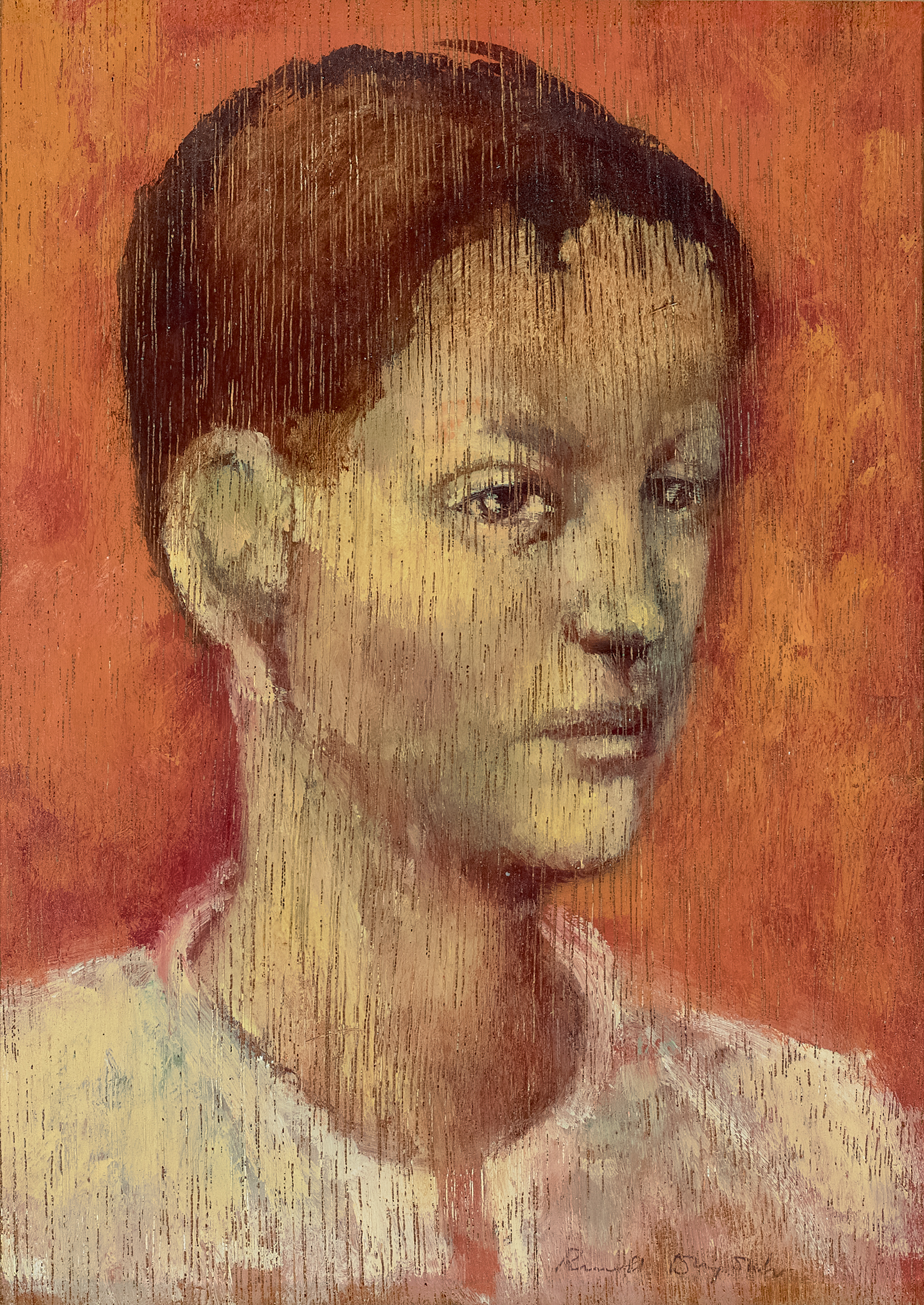 During the mid to late 1940s, Drysdale embarked upon a small group of portraits of children in the outback that reveal an acute awareness and empathy for the vulnerability and stoicism of childhood. Combining a sense of both the fragility and toughness of adolescence, Head of a Boy, 1950 is one such image which, with the sitter’s classical, ovaloid face and unwavering gaze, illustrates well the enduring influence of Modigliani upon Drysdale’s art. As is characteristic of many of Drysdale’s portraits, an overwhelming humanity and empathy pervades the work, transcending the individual to contemplate rather the universal human condition. As Professor Bernard Smith poignantly observed of Drysdale’s iconic Two Children, 1945 – 46 (National Gallery of Victoria, Melbourne) – another portrait of children from this period which features among the artist’s most widely admired images – ‘…By virtue of its formal perfection and profound but controlled feeling, the small painting reaches beyond the individual and the regional to express the consuming loneliness of humankind.’2