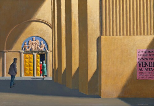This is further compounded by the pink poster to the right, Italian words truncated to celebrate other uncertainties. Translated, the words ‘Friday’, ‘Municipality of V[aldarno?]’ and ‘Jeffrey Smart’ may be clear; but is an auction sale to take place? And may ‘Roselavie Enr…’ be an anagram of the song ‘La Vie En Rose’, popularised by Edith Piaf? Or again, of ‘Rose Sélavy’ a pseudonym used by Marcel Duchamp, who challenged the very notion of art? Within the super clarity of composition, there remains a likely random jumble, temptingly suggestive without clear meaning. Colour, light and composition are his subject. Whatever we may find in Head Office, there is great pleasure in looking. Moreover, in a world in which noise is the greatest pollution, Smart’s silence is empowering.