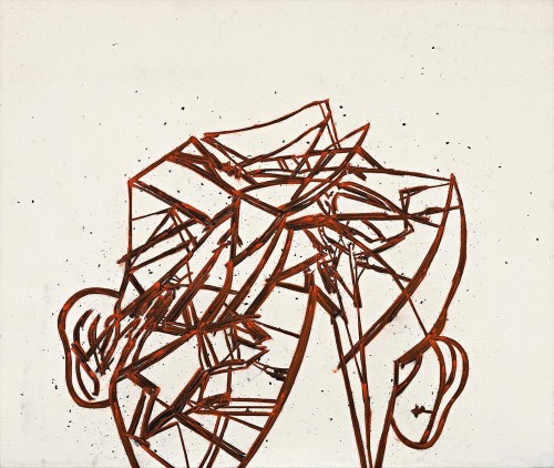 Strongly informed by his early investigations into the works of 18th century sculptor Franz Xaver Messerschmidt, Bevan’s paintings and drawings feature tightly cropped and disorientating perspectives of the artist’s own face. Rendered in a restricted chromatic palette and an almost sculptural geometric line, the contours of Bevan’s face appear time and time again on the canvas with a raw power that confronts and challenges the viewer. A former student of Goldsmith’s College, Bevan truly ascribed to their focus on audience-based interpretation and appreciation. This artwork is as much about the artist’s rendition of subject matter through unique materials placed on the canvas in a performative manner (he creates his works on the floor, leaving imprints of his own body weight in the warp and weft of the canvas) as it is about the viewer’s encounter with the portrait. Bevan’s unique composition forces the viewer to look at the image from a certain viewpoint, usually an atypical one. Head PC028, 2002 is a fine example of Bevan’s idiosyncratic style, demonstrating his emphasis not on likeness but rather a raw, radically simplified form of representation. Paul Moorhouse, the curator of Bevan’s 2011 retrospective at the National Portrait Gallery in London remarks ‘in Bevan’s art, self-portraiture has broken with its historic infatuation with recording personal appearance’.1