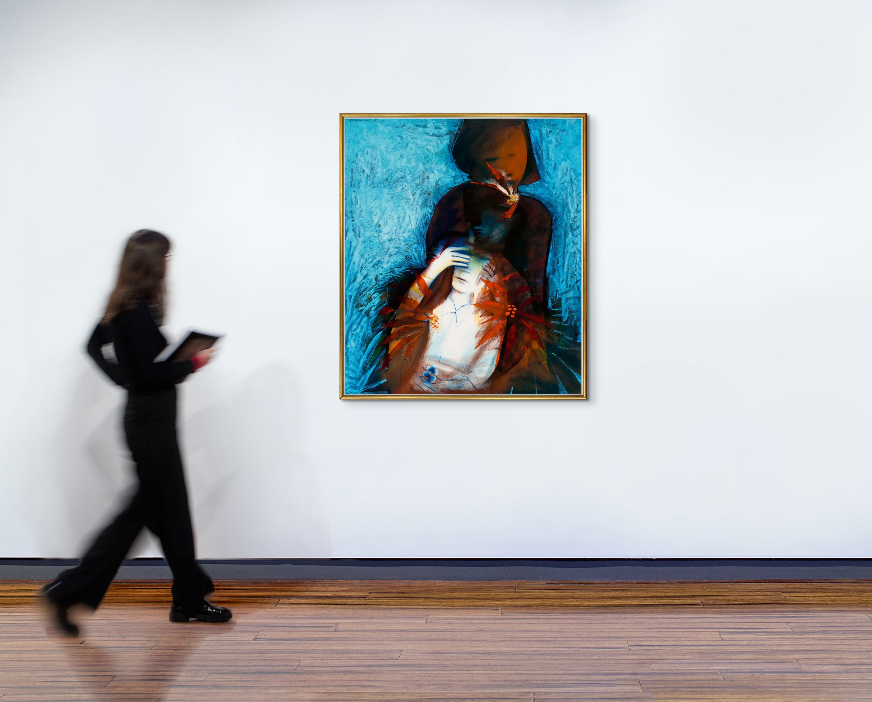 Blackman’s art explores emotion rather than a representation of physical reality. Seeking the poetic in hazy twilight zones, his dreamlike compositions are unfettered by rational space and the laws of the natural world. In Hide and Seek, Blackman indulges in a sensuous interplay of painted textures, toying with notions of opacity and translucency, between velvety richness of shadowed silhouettes and surprising translucent fireworks of scarlet poinsettias. Caught in their own collective world of play, and further fractured into separate, unknowable, interior worlds, these children are vulnerable and exposed to the outside world. We are voyeurs into their private game and like the central figure, our seeking is yet to provide answers.