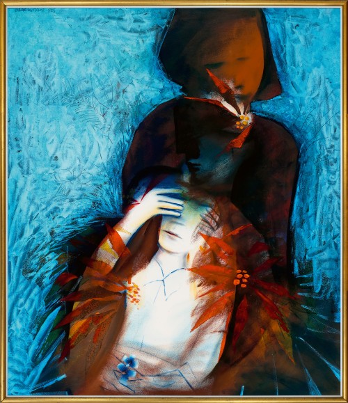 In the early 1950s, Charles Blackman formed a distinctive expressionist style using poetic figurative imagery exploring the innocence and interior worlds of children. The environmental circumstances fuelling the development of this motif are well documented: proximity to schools in the artist’s local suburb, his first wife Barbara’s professional interest in childhood psychology, and a honing of the artist’s skills in observation and recollection to support Barbara in her failing eyesight.1 While Blackman’s resulting ‘Schoolgirl’ series became a distinct suite of works, the themes of play and childhood interaction remained a constant wellspring of inspiration for the artist throughout the rest of his extensive artistic career. Painted in 1985, stark and gestural Hide and Seek, 1985 presents an amalgam of the artist’s most cherished iconographic motifs, imbued with a tropical palette inspired by the lush hinterlands of Buderim, Queensland where the artist was living with his second wife, Genevieve de Couvreur.