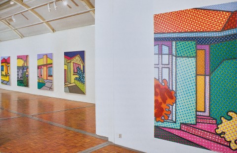 Catalogue contributor Marco Livingstone, emphasising the psychedelic look and experience of Arkley’s paintings of suburban houses, described the artist’s images as ‘gloriously, elegantly, deliriously uncouth’ and as a ‘springboard for a heightened sensual and pictorial experience, born of fantasy, daydreaming and escapism.’4 Clearly written with the aim of establishing a sense of connection, recognition and understanding between an international art audience and the artist’s quintessentially Australian images, Livingstone also highlighted Arkley’s connection to familiar Pop artists such as Patrick Caulfield and Richard Hamilton. However, given the positive reception of the exhibition on this global stage, it is fair to assume that an audience well-versed in postmodernism easily recognised and responded to the equivalence of Arkley’s high- and low-brow sources, to his investigation of formal concerns with colour, line and pattern, to his experimental nature, and to his deft handling of his materials. As Arkley’s first wife, artist Elizabeth Gower has remarked: ‘He had such control of the airbrush, it was like the sixth finger on his hand. His concentration was intense. One can only marvel at his ability to sustain it.’5