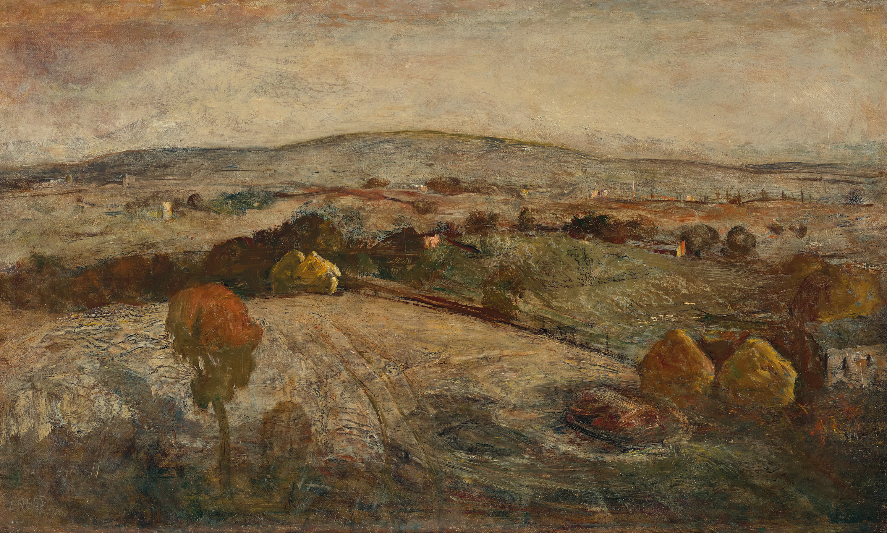 In his mastery of the landscape, Lloyd Rees imbued his paintings with life and atmosphere, overflowing with memories. Through the tilled soils and ancient buildings in his paintings of France, Italy and Greece, Rees celebrated man’s beneficial presence over the millennia. In Australia he brought that same humanising element to his work, of houses, haystacks and other evidence of habitation, as is so evident in Hills of Bathurst, c.1944. The fruitfulness of his views is matched by the fertility of his imagination, rich in romantic associations and bathed in light that is almost palpable. Brett Whiteley, who greatly admired Rees’s art, described his paintings as ‘completely real descriptions, yet abstract at the same time.’1 The formal qualities of his work are as appealing as the recollections they evoke. Landforms swell and whisper of fertility and the goodness of the earth. Of landscape painting, Rees wrote, ‘In the first case the inspiring moment would come from nature; a glimpse of exciting shapes and forms, or a passing mood of light or air. These would be fixed in memory by a sketch... and from this the picture would grow.’2 The painting, of course, ‘has an inner life of its own, independent of the subject matter’ and grew freely in the studio.