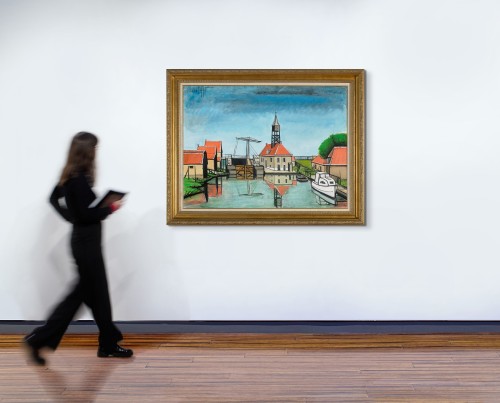 A recurring subject in Buffet’s landscape paintings, the canal and its sluice gate provided a linear architectural structure suiting the artist’s strong graphic and linear style, doubled in mirrored reflections on the water in the foreground. Closely related to a colour lithograph produced by Mourlot Editions in an edition of 150 in 1986, this view of the small town celebrates the enduring triumph of man over nature and the ingenuity of Dutch engineering. Painted from the vantage point of a swing bridge over the Zijlroede canal, the single focal point of Buffet’s strict linear perspective is the sluishuis, the historical landmark of the lockkeeper’s house built in 1619 and an important strategic building in this longstanding trading port. Strangely devoid of people, Buffet’s landscape is stilled and muted, painted with a restricted and unmodulated colour palette of the terracotta red of tiled roofs, bright green lawns and a sky tinged with grey.