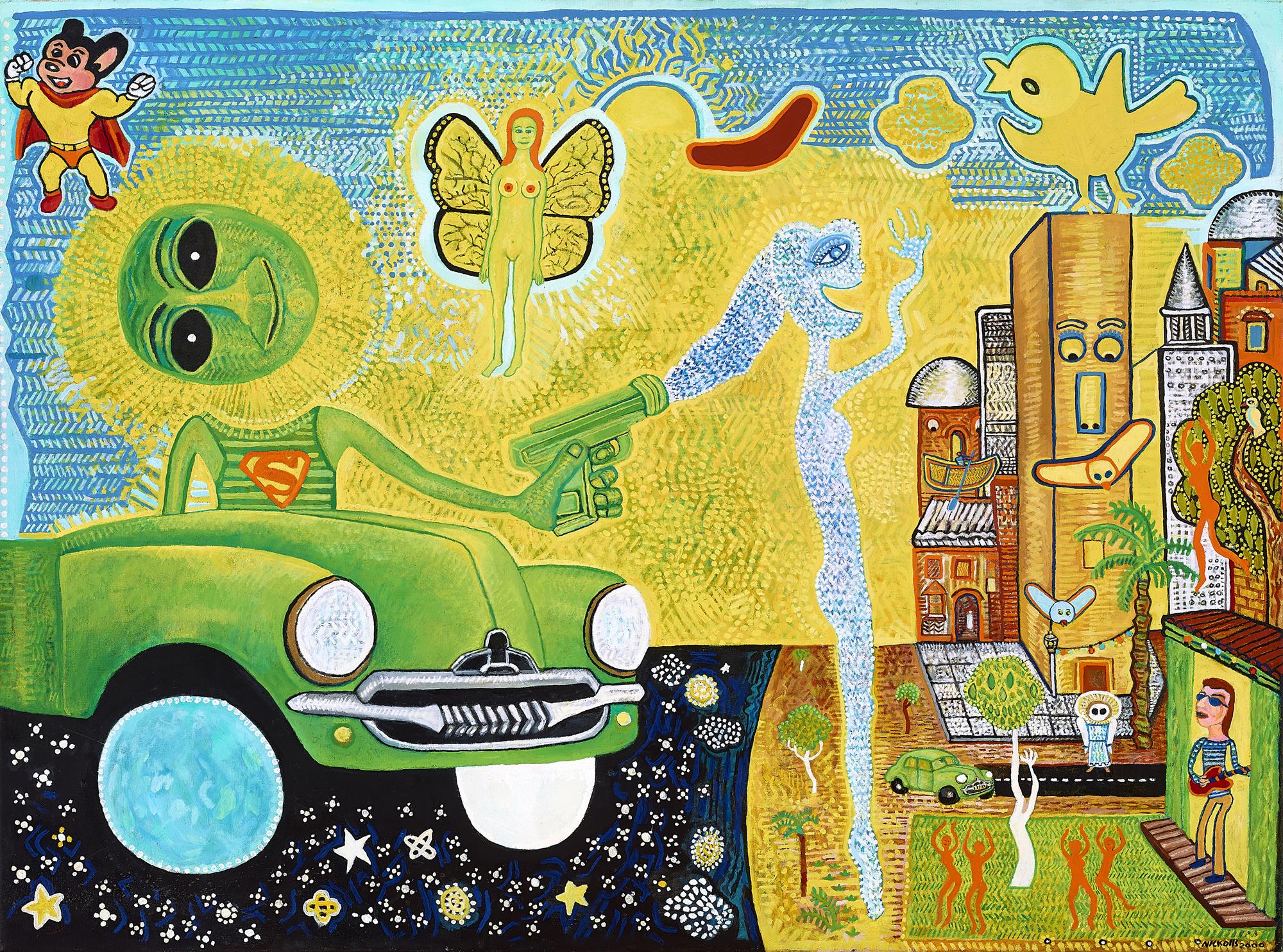 Holden Boomerang Dreaming in Summertime, 2000 is a typical Nickolls dreamscape, with its festival of colour, activity, juxtaposed Australian icons and both obvious and obscure meanings. The painting employs an assortment of formal elements developed early in his career and provides an insight into his world, moving between tradition and modernity, or what he called ‘dreamtime’ and ‘machinetime’.1 We have the superheroes and comic book influences of his youth, city buildings crowded together dwarfing the small Wanjina figure (dressed in western garb), a large non-indigenous rock musician playing to diminutive indigenous dancing figures and larger than life, an FJ Holden, the major focus of this work and also Nickolls’ first and most loved car. The scene is illuminated by the radiating sun and references to country, city, ancestors, night and day and a myriad of characters that heighten our ongoing examination and enjoyment of this work and its performative elements.