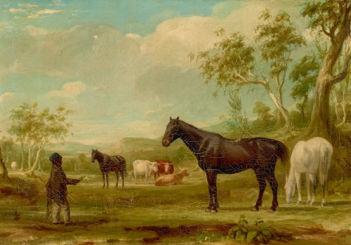 HORSES AND CATTLE WITH ABORIGINAL STATION HAND, WELLWOOD FARM, ORANGE, NSW, c.1840 – 1850
