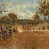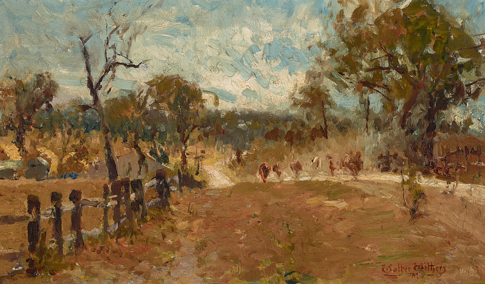 Withers was born in Warwickshire, far from the home in Cape Street, Heidelberg, where he and his wife Fanny settled in 1894. The climate was dramatically different. And it was here, many agree, that he painted some of his finest works, from smaller, engaging atmospheric studies, as in our The Hot Road, to the major compositions such as Tranquil Winter, 1895, purchased the same year by the National Gallery of Victoria. His stature as a landscape painter of considerable note was confirmed when, in 1897, he won the first Wynne Prize for the best landscape painting of the year with The Storm, 1896 (Art Gallery of New South Wales, Sydney). He was awarded the prize again in 1900 with Still Autumn.