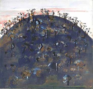This painting contains various features and techniques which marked Williams’ arrival as a great painter: a simple, withheld but grand compositional arrangement, a subtle yet complex surface with painterly inflections suggesting, but seldom descriptive of, characteristics within the landscape. These are thickly applied calligraphic gestures, each with a colour and tonal range of their own. James Gleeson wrote, ‘I think the secret of Williams’ ability to depict monotony without being monotonous lies in the perfection of his placement … each spot or squiggle signifying a tree trunk forms part of a constellation whose pattern seems haphazard but whose placement is ordained by one of the most refined aesthetic sensibilities of our time’.7