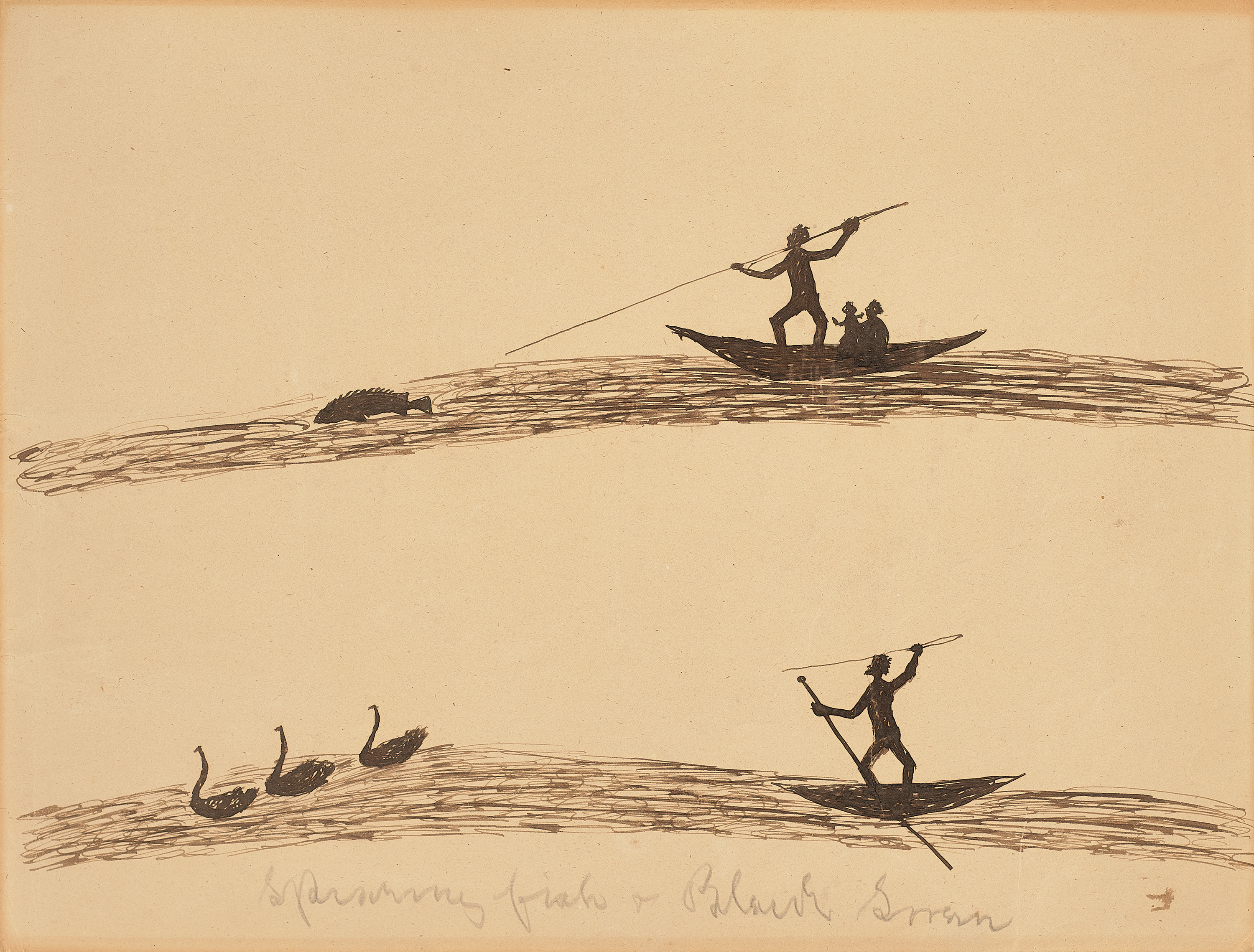 ii. inscribed with title lower centre: Spearing fish and Black Swan