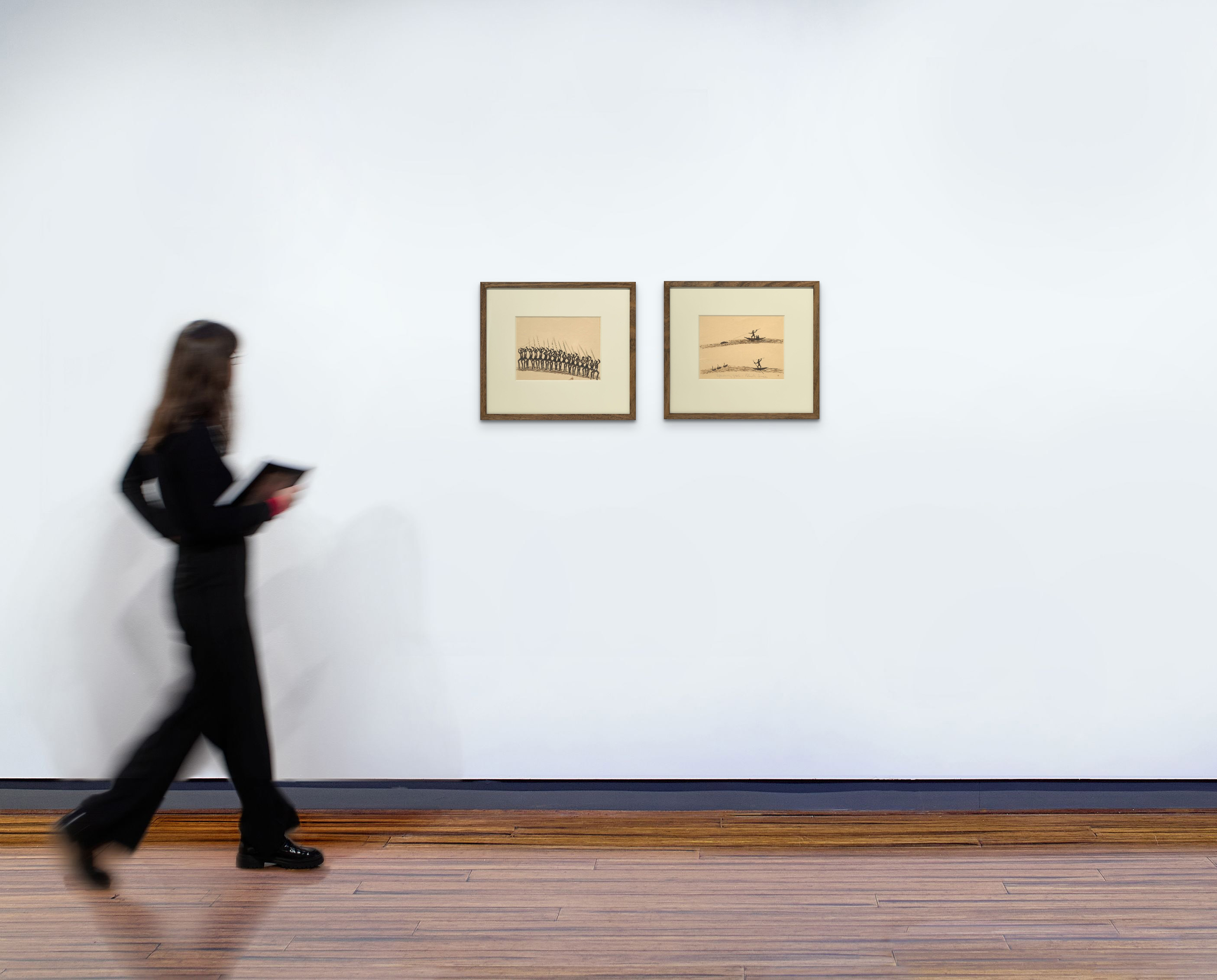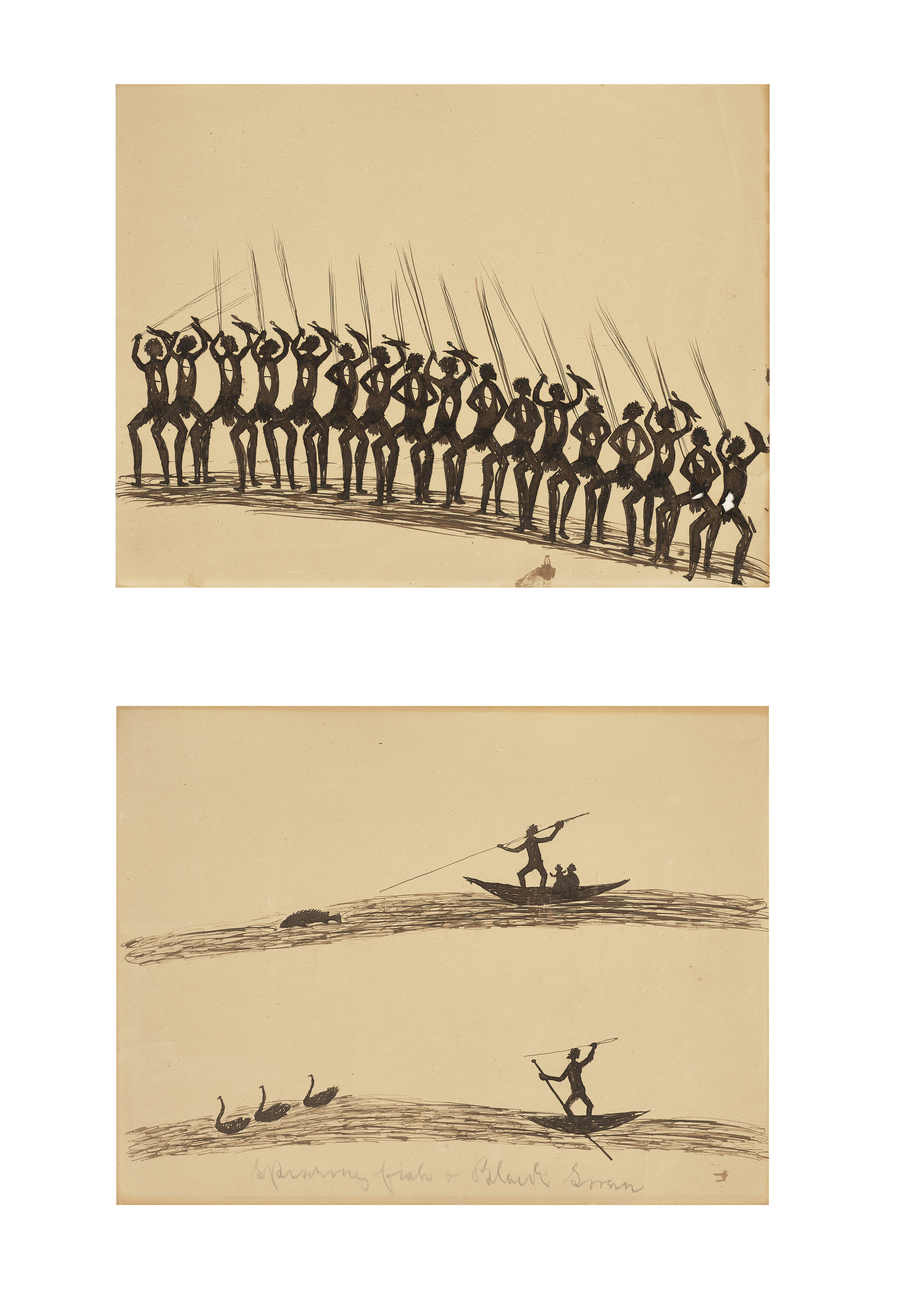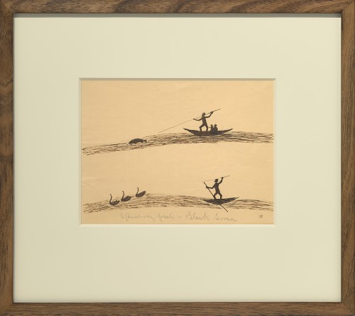 The second drawing records another of McRae’s preferred subjects, food gathering and hunting. Spearing Fish and Black Swan shows a hunter spearfishing from a bark canoe. Fish and birds were a stable part of the diet of the Indigenous people along the Murray River, consisting not only of Murray Cod (Maccullochella poeli) but also black swans and other waterbirds which were also hunted in this manner. These works tell a story, a pair of narratives of the hunt, one above the other, ‘his favourite motif is a scene where the prey is about to be captured – a moment pregnant with promise’2 and in both scenes, we observe the instant just before the hunter releases his spear.