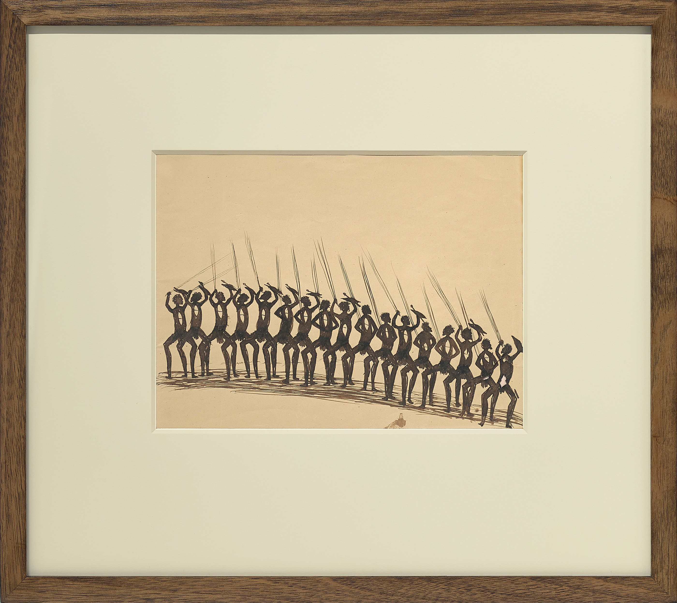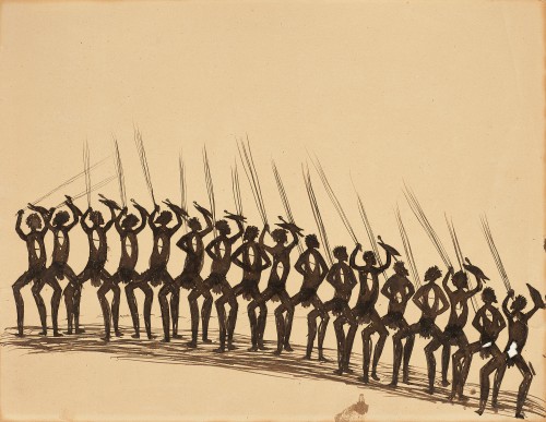 These two drawings were presented as a gift to Mr Justice T. C. Davis, the retiring High Commissioner for Canada at the completion of his term in May 1946, by Harold Cox, the the Melbourne Herald's Canberra Press Gallery journalist at the time who had inherited the works by descent from his grandfather, Roderick Kilborn. Both drawings record traditional aboriginal life. The subject of the first work, Ceremony, is one of McRae’s most frequent subjects and is perhaps a recollection of earlier experiences. Typical of McRae’s illustrations of these events, the ceremonial dancers are drawn in a row across the page from edge to edge in a frieze-like pattern. The dancers stand, legs wide apart, bent at the knees each interlocking with the next. All bear decorative body designs and hold a man’s hunting kit of spear, club and spearthrower. The integrated forms of the figures and the movement of the spears overhead create an effect of dancers moving in complete unison.