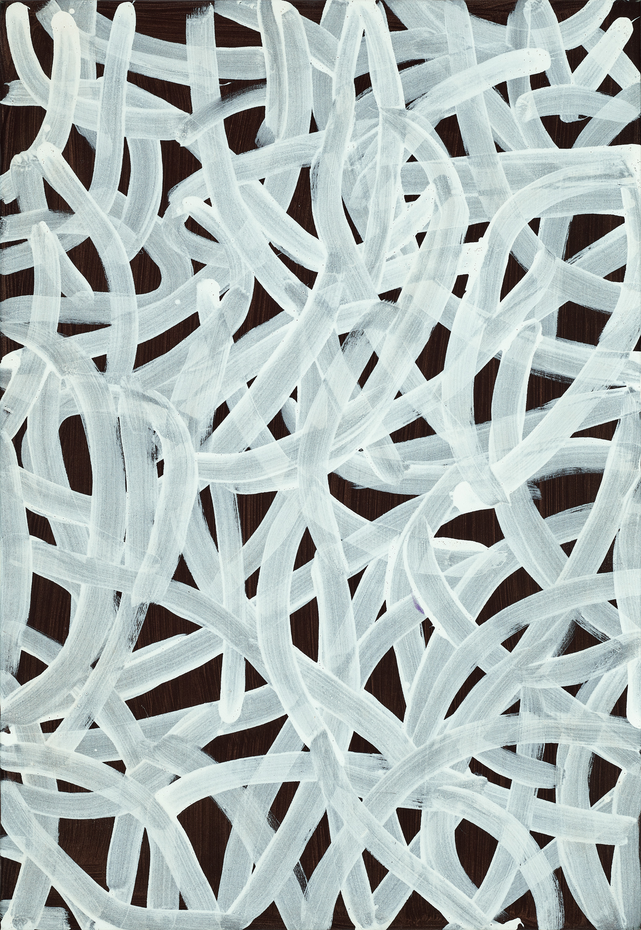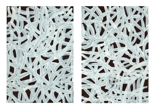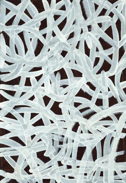 Commissioned by Rodney Gooch in November 1995, Untitled (Yam Dreaming I), and Untitled (Yam Dreaming II), are among a small group of powerful and dynamic monochromatic canvases executed on a black ground. Produced between 1995 and early 1996, this phase of her production was characterised by solid meandering lines and are masterpieces of strength and simplicity. The single colour, in this case a bright white, is applied deliberately with web-like traceries energetically spread across each canvas. The sweeping arcs of white paint intersecting, overlaying and crossing in a series of gestural strokes mirror the subject of her painting – the meandering rhizomatic roots of the Arlatyeye plant (the pencil yam - Vigna lanceolata) and the cracks that form in the ground when the pencil yam ripens – while at the same time highlighting the intimate process between artist and canvas.