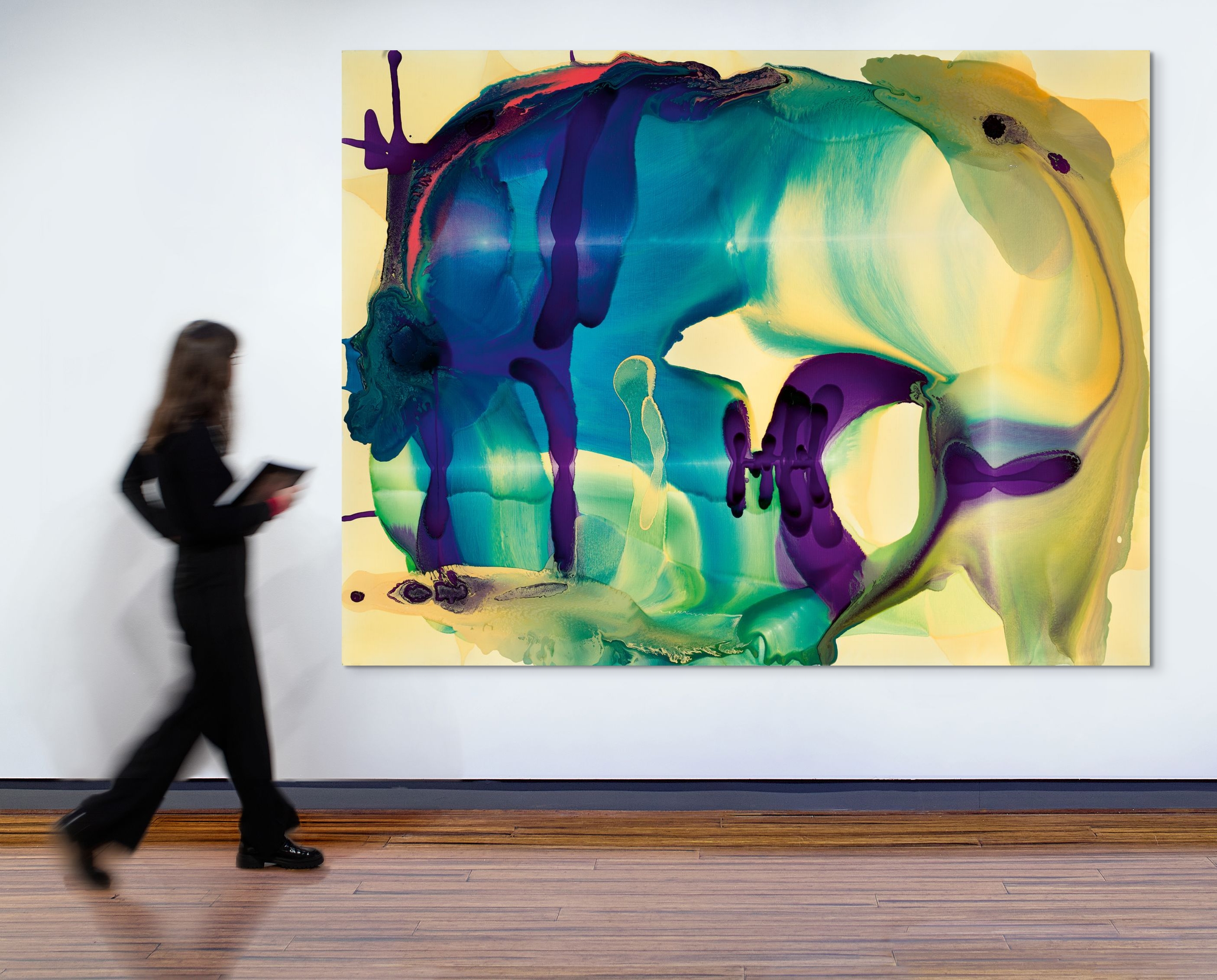 Indeed, despite their inordinately specific, often witty titles and the swirling tides of sensuous, tinted varnish which seem to convey the forces of nature in a manner reminiscent of Romantic painting, Frank is emphatic in his eschewal of any reference to the literal – his works are neither real nor imagined. Rather, each performance ‘creates itself’, evolving over time through the movement and chemical reactions between layers of strident, pulsating varnish in its molten liquid form (‘a living entity’). As Frank elucidates, the blank white canvas is never a pristine ground that must be filled, rather ‘a black space’ where the final outcome is ‘forced upon the Painting by the vagaries of its own Nature and makeup: its environment and material personality determine its image, its future, its relations within the world.’1