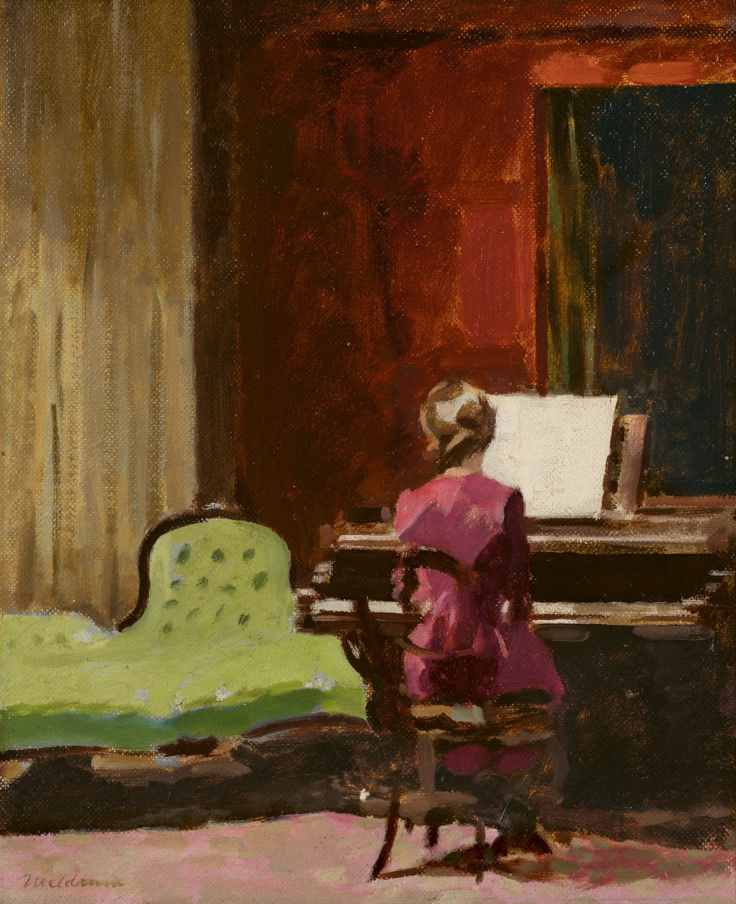 Ida in the Studio, 1943 depicts Meldrum’s first born daughter Ida (1906 – 1990) at the piano in his Kew studio. Meldrum painted a number of interior scenes during his later years, and this work relates to a similar composition purchased by the Queensland Art Gallery I Gallery of Modern Art in 1952. Other interior paintings by Meldrum are held in the collections of the Art Gallery of New South Wales; Bendigo Art Gallery; Castlemaine Art Museum; Geelong Gallery; and McClelland Gallery & Sculpture Park.