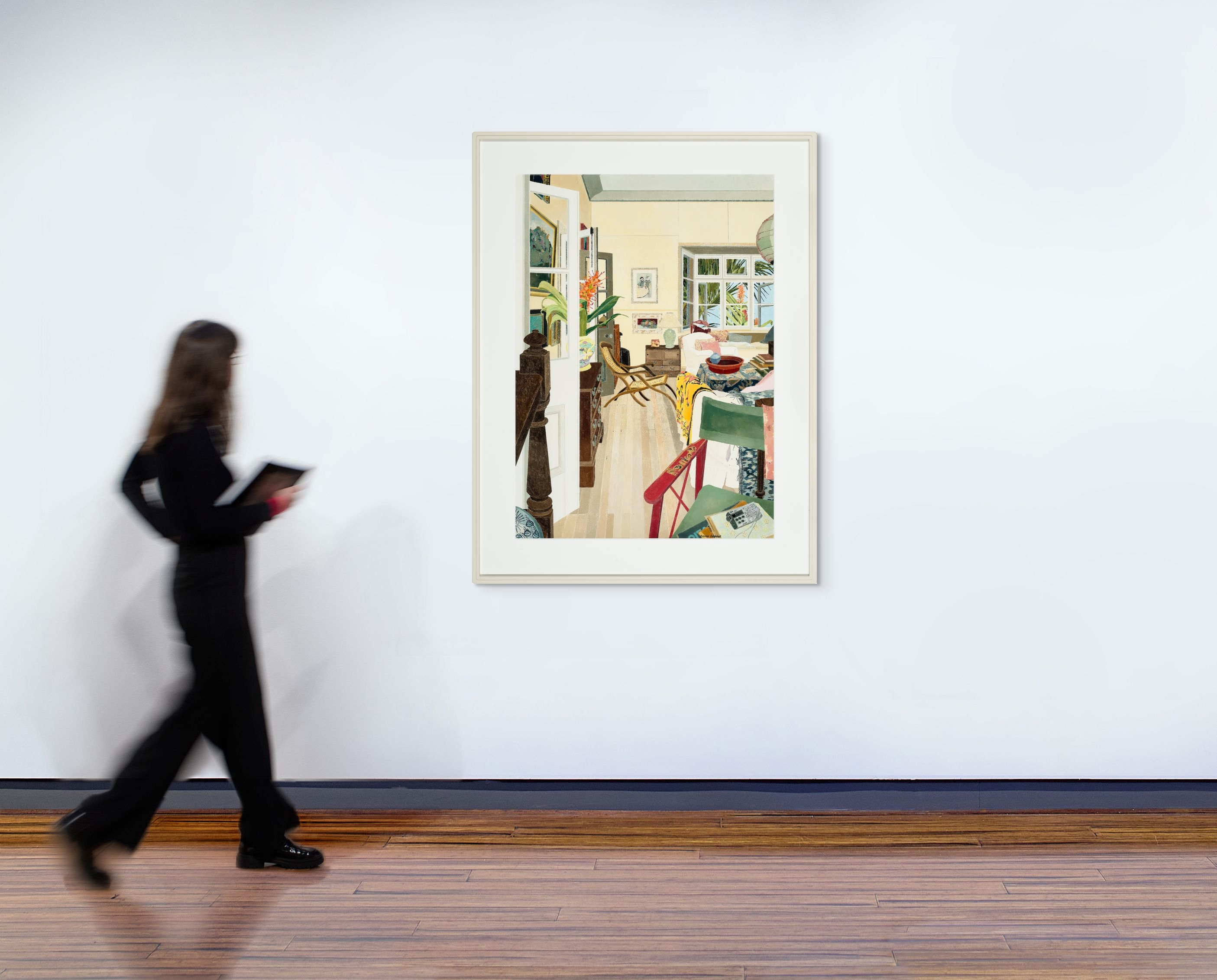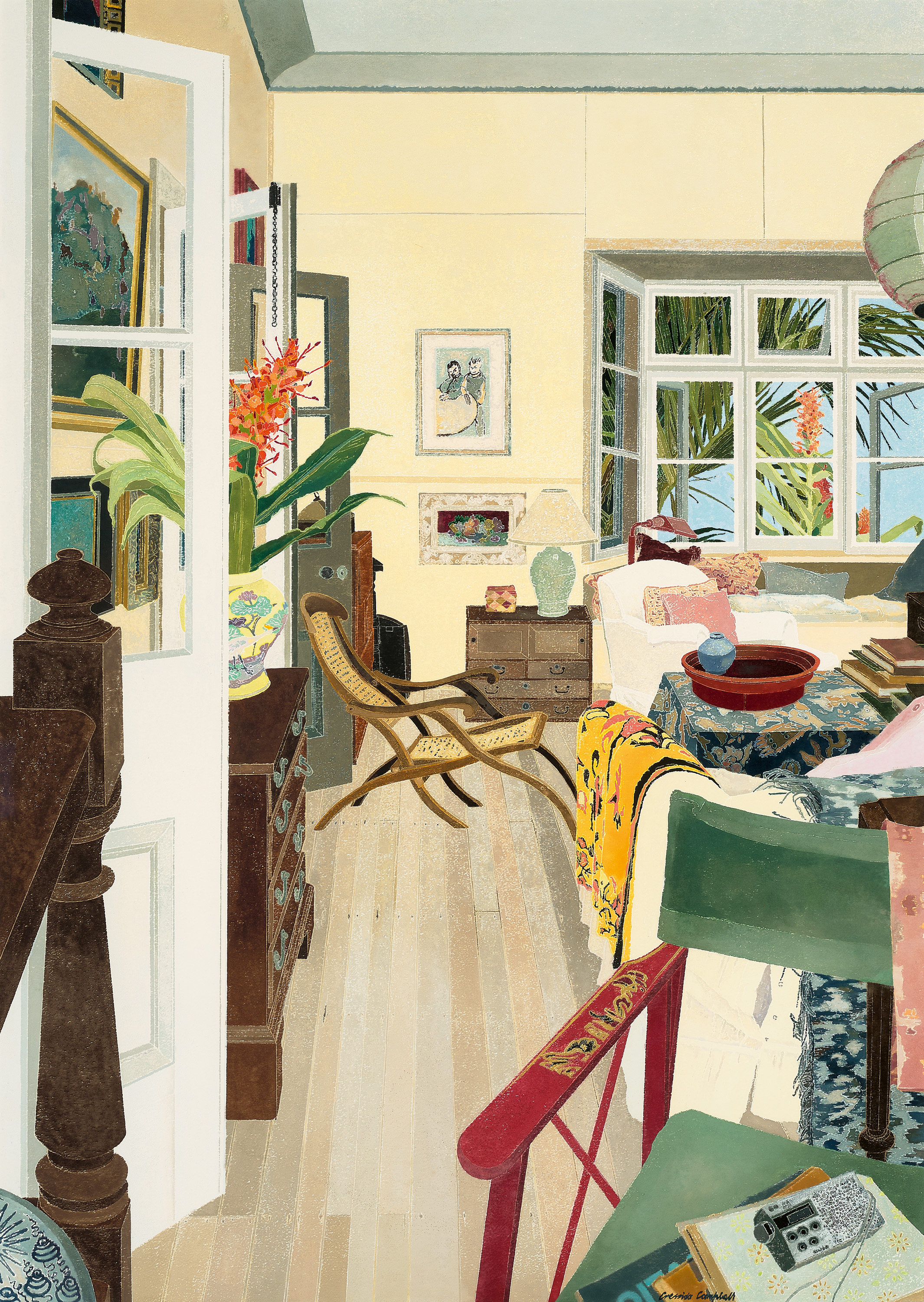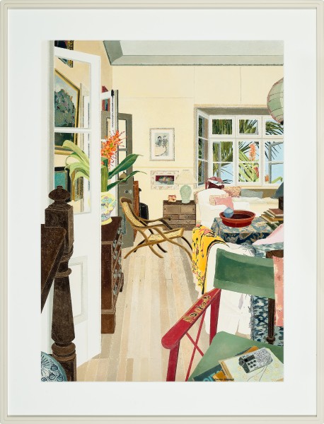 This sun-drenched and softly mottled woodblock print, Interior with Red Ginger, 1998 displays an interior view of the airy seaside home of the artist’s friend Lynne Clarke (née Drysdale) in Newport. Campbell elaborated on the influence of this friendship in an audio recording for the National Gallery exhibition: ‘[she is] one of my oldest friends and she's been a huge influence to me in interiors and gardens and the way she places things. [...] She'll arrange plants amazingly, [an] incredible gardener. [..] I mean it's brilliant interior design really.’2 The arrangement of contrasting textural details; of tropical floral combs with shiny broad leaves, white linen couches strewn with soft blankets, worn blond floorboards and discarded camcorder in the foreground alludes to an insouciant holiday atmosphere, with the room perhaps only recently vacated by its bare-footed inhabitants.