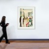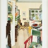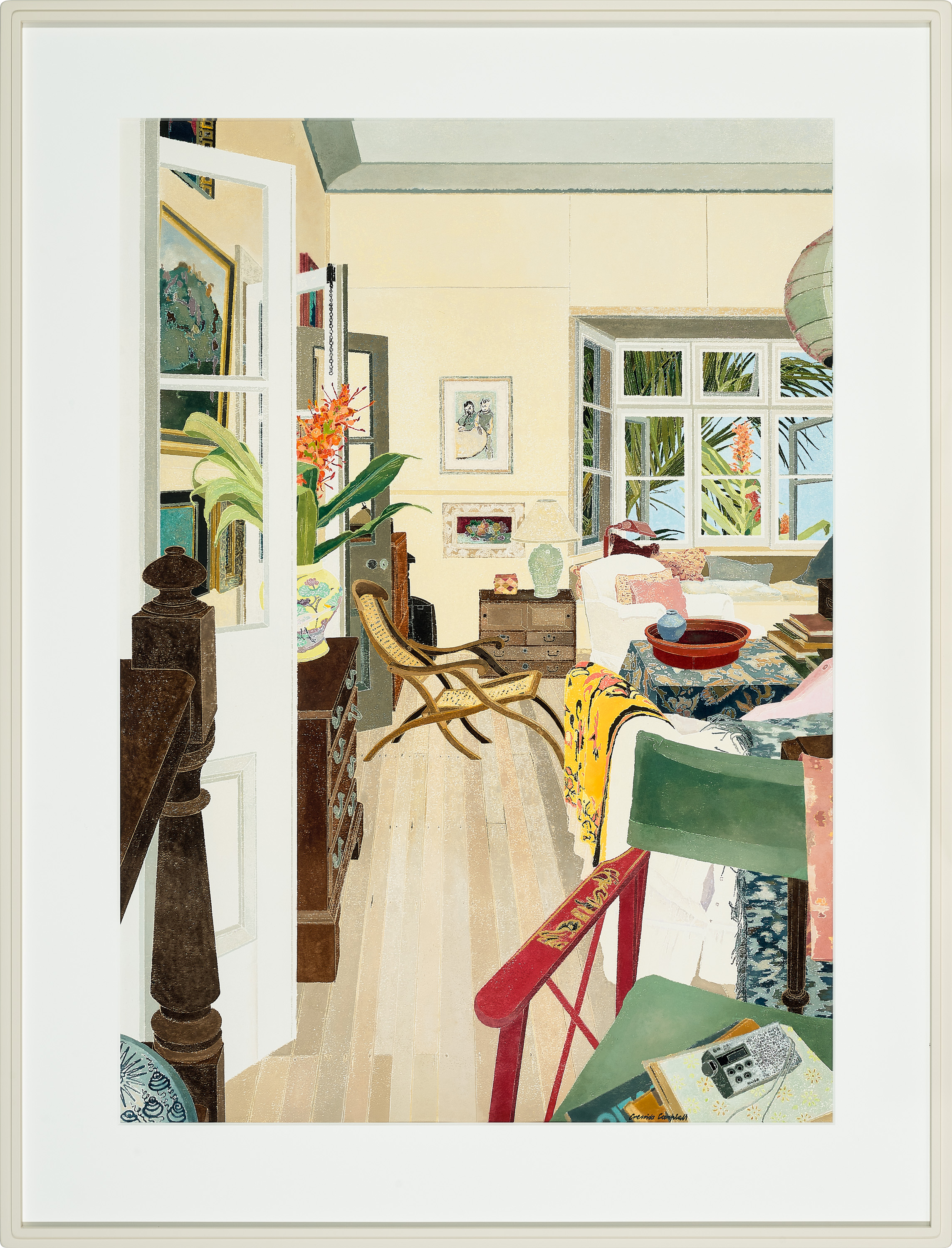 It is clear that Campbell is a pure aesthete. Her works are sublime, carrying no socio-political impetus, nor aiming to surprise or shock viewers. She delights in the form and colour of everyday objects, translating and manipulating them into artworks that express the enduring appeal of quiet tranquillity. Although singled out in the title of this print as the key identifying feature of this interior, the spiky cylindrical clusters of the Ginger Lily are partly obscured in the left-hand side of the image. They are placed within a complex intersection of angular planes and panes of glass, between framed artworks on the wall and French doors opening presumably to a verandah out of view. While the dark timber balustrade anchors the composition in the left-hand corner, the whitewashed window frames of the bay windows in the upper right reveal a brilliant blue sky, with palm fronds and a second ginger blossom, connecting the interior with the world beyond. Here Campbell is at the height of her technical proficiency, delighting in the intellectual game of representing pictures in pictures, using a printing process that itself requires a mastery of reflected images.