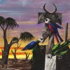 Tucker’s absolute confidence and utterly bold approach to picture-making is on clear display in Intruder and parrots, 1964 – 68, a major painting of the period that summarises many of his key concerns. In visual terms, colour is the dominant feature. In the background a brilliant yellow and orange glow emanates from the setting sun, transformed via broad brushstrokes into the colours of dusk towards the top of the painting. The parrots are also vividly coloured, but it is their attitude of aggression towards the figure in the painting that is more significant. Explorers are often beset by parrots in Tucker’s work, a symbolic representation of their lack of familiarity with the environment that conveys something of the European settlers’ struggle against an alien landscape. In this picture however, the figure has become an intruder – horned, fearsome, devoid of colour and carrying a rifle – whose trespassing into territory where he doesn’t belong prompts the birds’ decisive response.