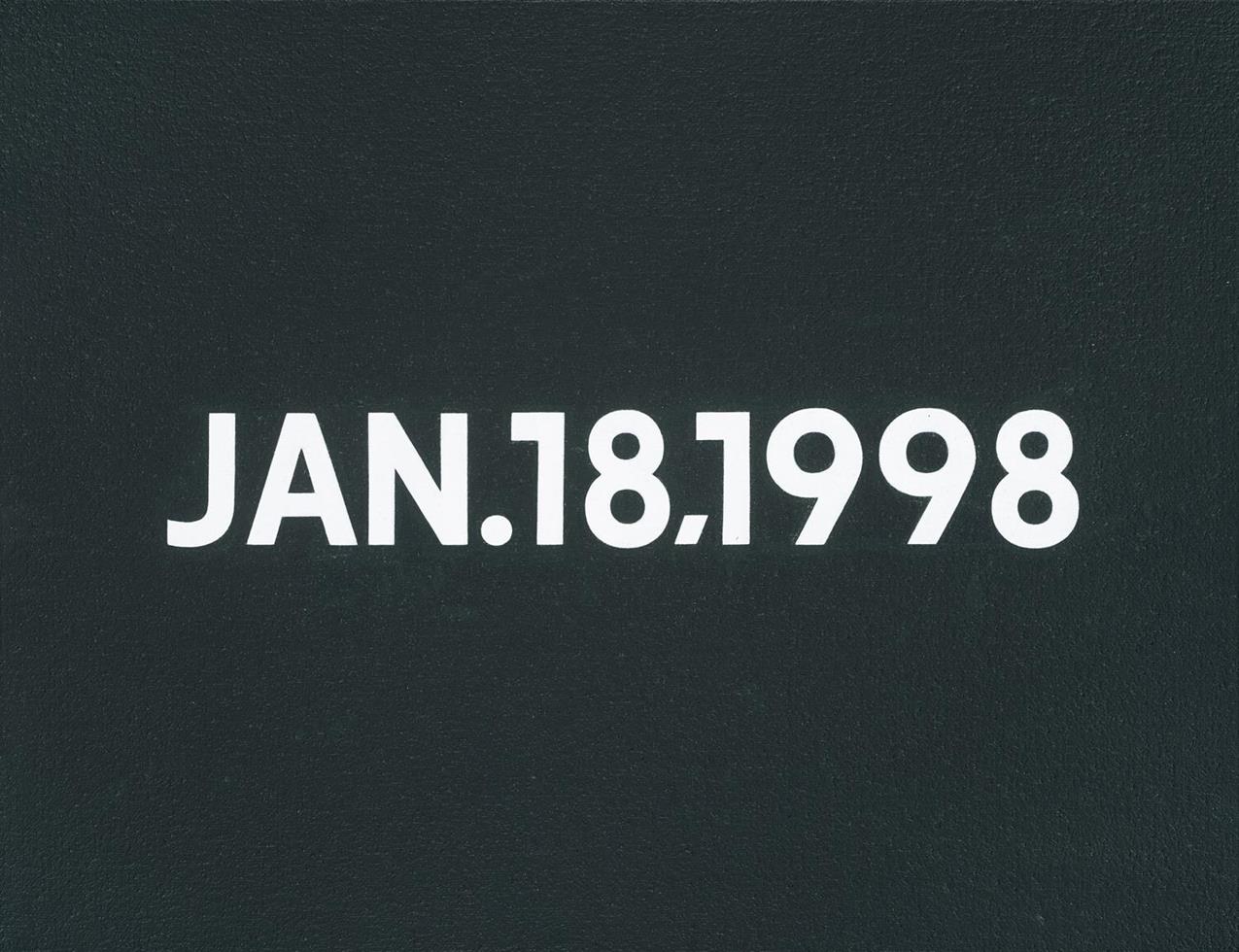 Using reduced material means, the works of On Kawara’s Today series are products of a mindful communion of time and space within the realm of one individual’s experience, all the while sharing in a universal collective consciousness. Minimalist and cerebral, the Today paintings are journalistic impulses expressed through a codified methodical process, all following the same format: three alphabetical letters and six Arabic numerals arranged in a sequence that describe the painting’s date of creation stencilled in white synthetic paint in the centre of a monochrome canvas, changing only slightly in colour, size, and syntax. On backgrounds of the artist’s own hand mixed colour – in a limited palette of red, blue or, most commonly, a deep grey, the Today paintings can be grouped in pairs, week or decade long sequences, or simply exist as stand-alone moments authenticated by their associated paperwork. Jan. 18, 1998, 1998 was the first date painting Kawara completed in that year, as the No. 1 inscribed on the reverse of the artist’s label indicates, painted on a Sunday (also included in the subtitle of the painting) in New York City, where the artist maintained a home.