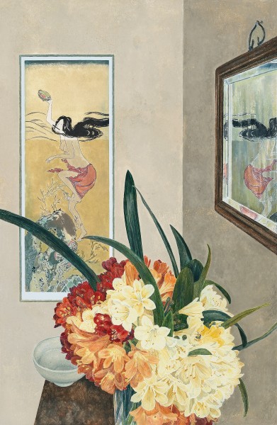 An old-fashioned aesthete and collector, Campbell has filled her homes with a small treasure trove of textiles and bunches of cut flowers amongst artworks and objets d’art, ‘rare pieces and mere curiosities, but everything has been chosen for pleasure, not monetary value’.1 Many of the objects in the artist’s home and reproduced in her pictures carry stories about the artist’s life and her relationships, providing motifs that are carried throughout her oeuvre. The Japanese print referred to in the title of this artwork is in fact a silkscreen copy of a rare Ukiyo-e print of a Japanese abalone diver.2 This facsimile was created by John Coburn’s daughter, Kristin, for Campbell’s old friend, the artist Martin Sharp, who had owned and then lost the rare print in the 1980s. In contrast to the cossetted courtesans and geishas of other Ukiyo-e prints, the ama abalone divers were women liberated from societal expectations. In Japanese Print and Clivias, the diver inhabits many planes, travelling between the underwater world, the surface and another, more surreal plane in the mirrored surface, her hair flowing in invisible currents.
