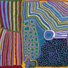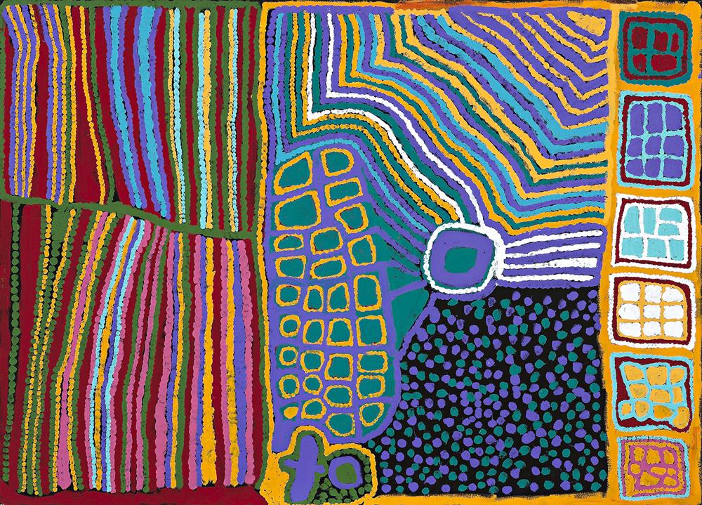 This painting is accompanied by a certificate of authenticity from Short Street Gallery that states: ‘This is Weaver’s Grandfather’s country, Jabinka close to Well 33 in the Great Sandy Desert. This painting shows the people sitting down and their walking tracks as well as depicting the jilas (living water) and tali (sand dunes).’