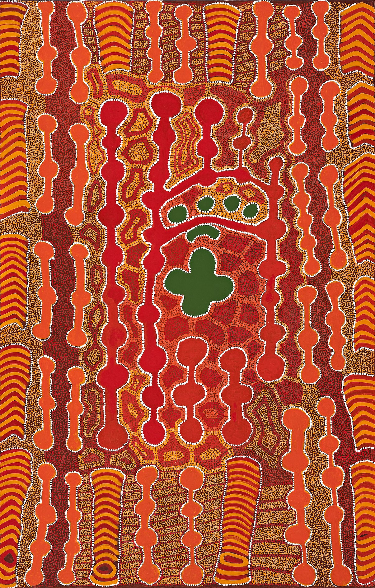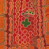 Another common feature integral to navigation in this area is the jilji, the sand ridges depicted running vertically through this work. These are permanent formations that stretch across much of the Great Sandy Desert and are significant features in Pijaji’s country. Directions are expressed in the number of jilji between places, by their height and proximity to one another. They may form wide parallel corridors allowing broad vistas, or collide and intersect in maze like patterns that thwart easy passage. Pijaji also includes in this work the knots that appear along the line of the jilji known as kukurrminti kukurrminti – bowl-shaped depressions at the top of the sand ridges that provide shelter, firewood and seed plants.