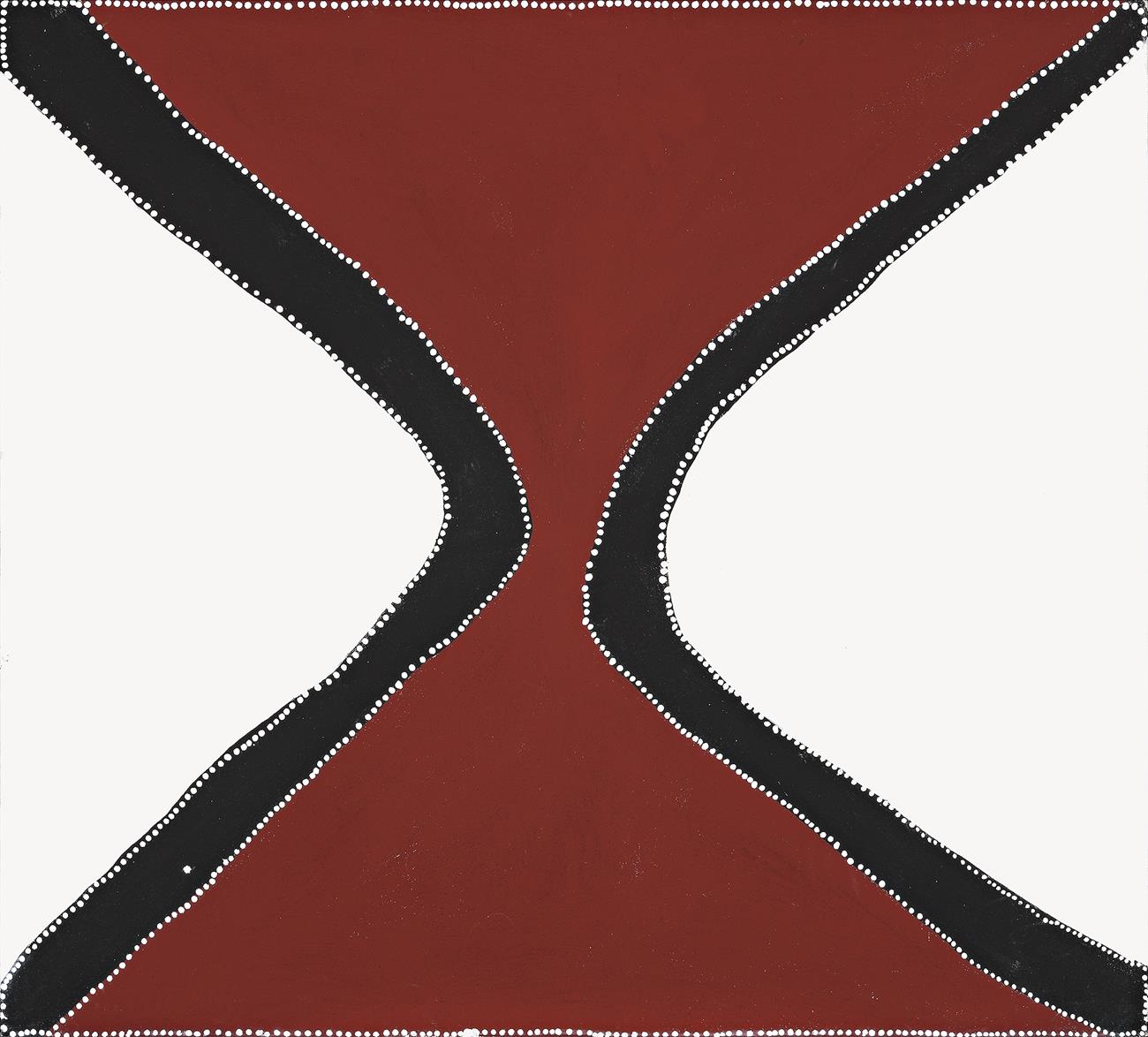 Jirljin (Red Pocket), depicts two big hills separated by a narrow gap through which people passed either on foot when walking though country or on horses when mustering cattle. The artist used to ride through this country when, as a young man, he worked as stockman. The ochre palette highlights Bedford's link to the more familiar style of the earlier east Kimberley painters Rover Thomas and Paddy Tjamatji, but the large dominant forms along with the interplay between positive and negative space signal the original vision of an artist who created his own representations of country, a harbinger of what was to come.