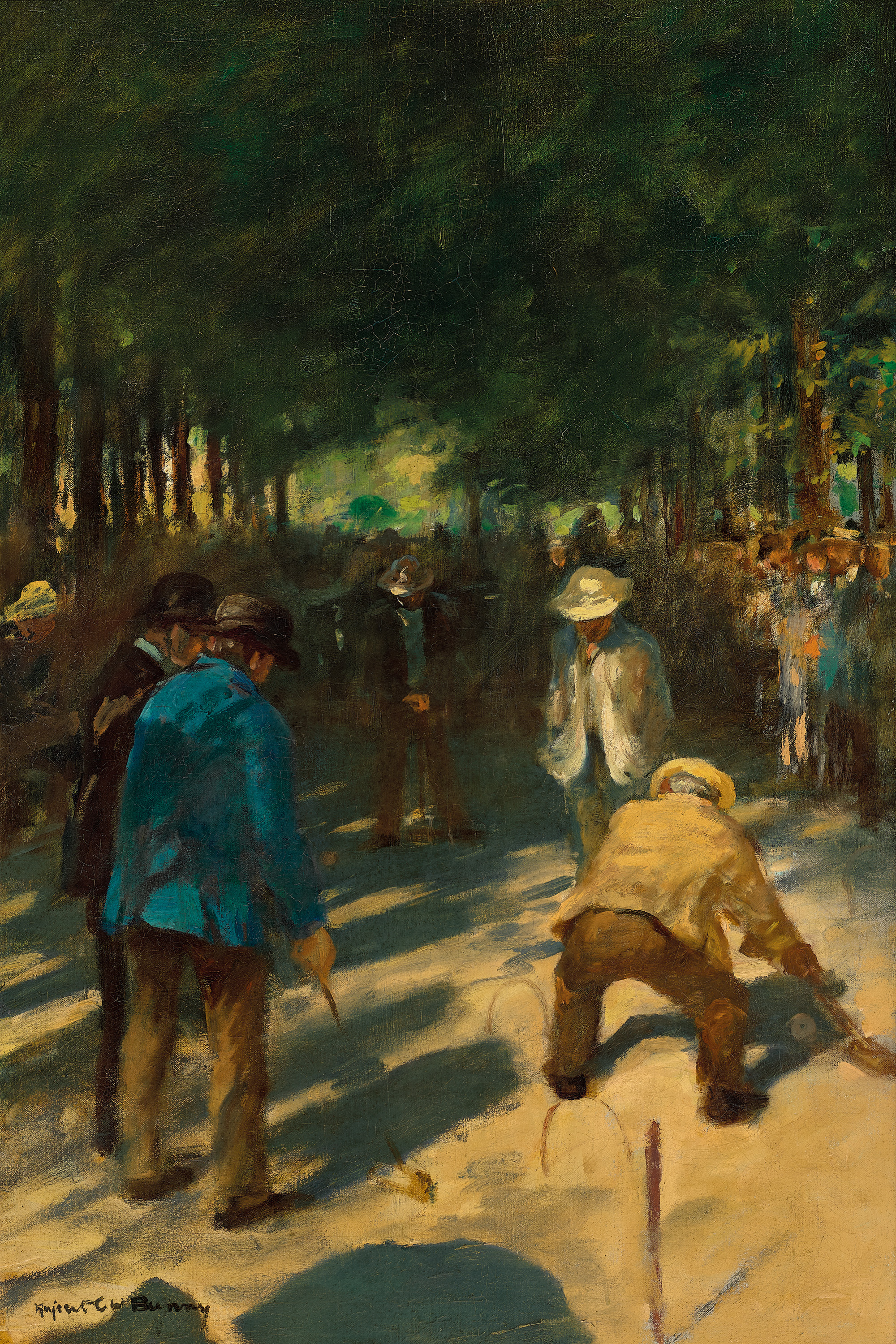 Capturing brilliantly the spirit and élan of Parisian society in these pre-war years, Jouers de Croquet, Luxembourg, c.1909 attests to the way in which Bunny successfully created an art appropriate to his time and the conditions of modernity – assimilating avant-garde modes into establishment practice. Transforming the prosaic into the poetic, thus Bunny offered contemporary audiences a vision of the everyday exuding joie de vivre and ‘…a peaceful remoteness from the ‘sturm and drang’ of modern life’.3 As leading French art critic of the day Gustave Geffroy observed of the artist’s celebrated solo exhibition at Galerie George Petit, Paris later that decade, Bunny’s paintings express ‘the luminous joy of daylight… and the pleasure of living in the shadow of trees looking out on a festival of sunshine… [He] is a realist and a visionary, an observer of truth and a poet of the world of dreams.’4