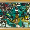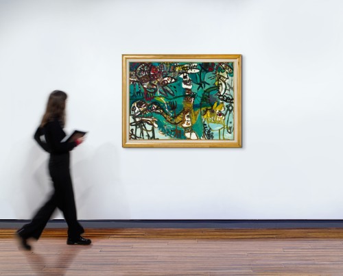 An important prelude to these masterpieces, Journey Through the Sea Port, 1961 not only attests to Olsen’s ‘lifelong love affair with Sydney Harbour’2, but reflects the artist’s increasingly fluid approach to the boundaries between abstraction and figuration in the wake of the infamous Antipodean Manifesto polemic that had divided Sydney and Melbourne art worlds in 1959. Notably, where his grid-like seaport paintings of the mid-1950s had demonstrated a predominantly figurative emphasis, in the early sixties Olsen now expressed his affection for the harbour in a much more organic and empathetic way3, with the undulating tides that connect the city and its inhabitants tangibly captured in both the fantastic abstract forms and the sensuous physicality of the paint surface itself. Betraying the artist’s keen interest in the interchangeable, metamorphic imagery of Pacific and Melanesian art at the time, thus disparate hybrid images of human, animal and vegetal forms here merge and flow into one another, all organically uniting within the seascape – everything happening at once in joyful homage to the circus of living. Raw colour applied straight from the tube, together with pulsating calligraphic brushstrokes set against a ground of sonorous blues further enhance this celebratory spirit, creating a bold, dynamic composition that resonates with a Vitalist energy.