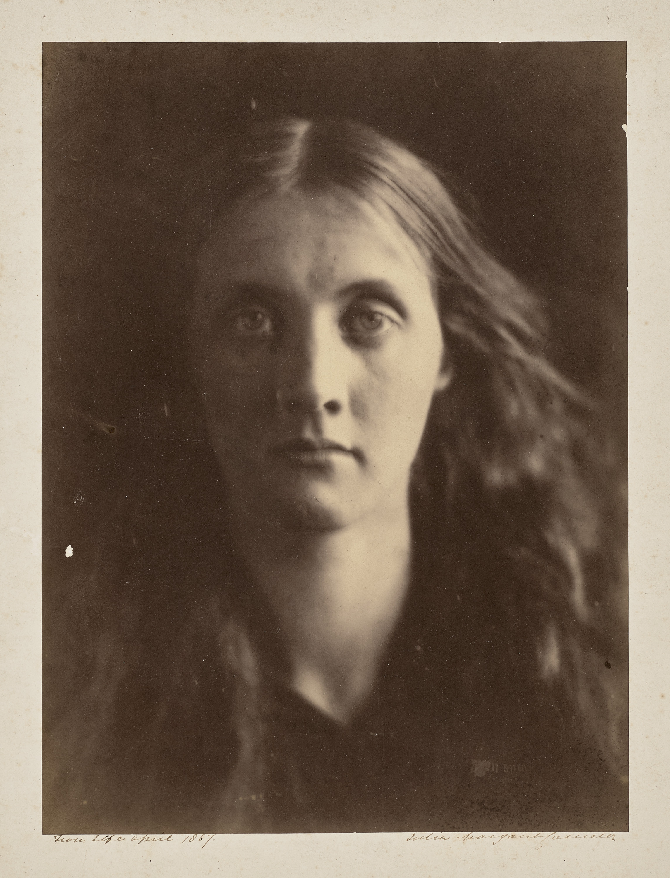 While Cameron photographed many famous faces, including Charles Darwin, Alfred Lord Tennyson and Charles Dickens – all of whom lived nearby on the Isle of Wight – family members also featured in her work. Her niece, Julia Jackson, known as a great beauty, was the subject of more than twenty photographic portraits. This image, arguably Cameron’s most iconic portrait of Jackson, was taken shortly before her first marriage and signed by the artist, it is inscribed ‘From Life April 1867’. Its composition is simple and direct, focussing on Jackson’s face framed by long flowing hair, and the lighting, which casts half of her face in shadow, emphasises her distinctive and elegant features. Jackson may be familiar to many because of the striking resemblance between her and her daughter, the writer Virginia Woolf.2 A poetic study of youthful grace and beauty, this photograph also reveals something of the subject’s character as she confidently returns the camera’s gaze. Prints of this portrait are held in numerous public collections including the Victoria and Albert Museum, London, and the Metropolitan Museum of Art, New York.