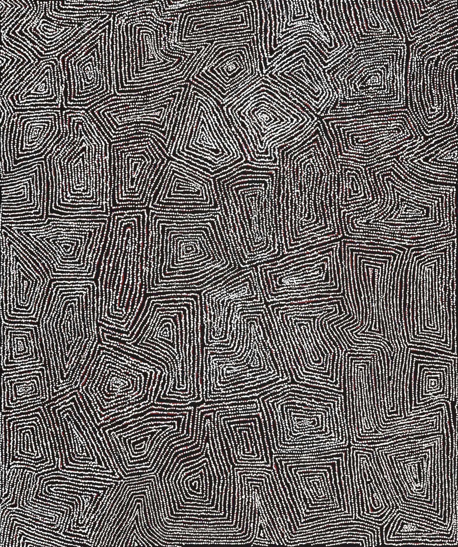 This painting is accompanied by a certificate of authenticity from Papunya Tula Artists that states: ‘This painting depicts designs associated with Kaakuratintja (Lake MacDonald). In mythological times a large group of Tingari Men travelled to this site from Kulkuta, south-west of the Tjukula Community. The Kuningka (Western Quoll) Dreaming also travelled this same route.’