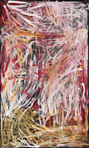 Kame Colour XII is a quintessential Kngwarreye work. Painted during the final year of her life, it encapsulates all the hallmarks of her best work in the hints of fire, rain, spinifex and nightfall. For an elderly lady she painted with the energy and enthusiasm of a youth, with brushstrokes arguably evoking the work of Jackson Pollock at the height of his powers. But for all her fame as a painter Kngwarreye did not begin painting until she was 80 years old. Her creative career began as a founding member of the Utopia Women’s Batik Group, which began in 1977, and significantly, her painting retains elements of her early batik work. The Holmes à Court Collection had began sponsoring similar projects, which led to the Utopia artists becoming nationally and internationally renowned. In 1997, Kngwarreye represented Australia in the Venice Biennale, and the Queensland Art Gallery also staged a major retrospective that travelled throughout Australia. In 2011, a second major survey travelled from the National Museum in Canberra to Osaka and Tokyo.