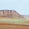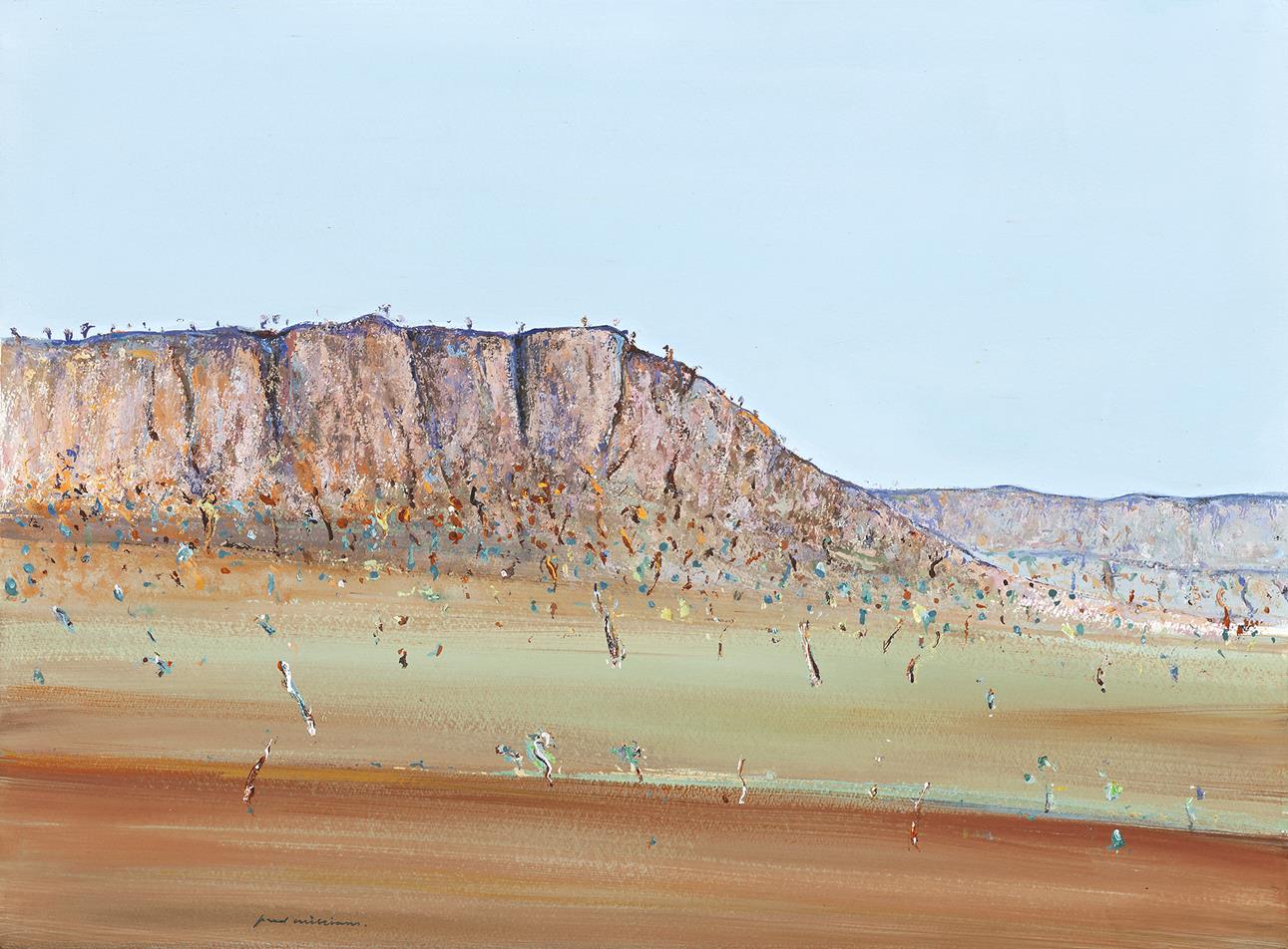The lands that form the Pilbara region are ancient and rich with minerals. Residing at Karratha Station, a country property fifteen kilometres from the coast, Williams surveyed the rugged outline of the Hamersley Range enclosing the echoing empty landscape. He studied the nuances of this strange landscape and became fluent in their expression in paint. Karratha Station incorporates many of the most dramatic features of this other-worldly outback landscape, trees dwarfed by rugged red cliffs, a low horizon buckling under an enormous expanse of blue sky, seams of bright mineral deposits segmenting the landscape into successive layers, interspersed with fields of spinifex and wildflowers. Remarkably detailed and naturalistic while retaining the distinctive Williams brushstroke, Karratha Station is characterised by touches of paint and lines laden with pigment set against a sweeping wash, its delicate tones evoking the overwhelming vastness of the artist’s vista of this timeless and enduring landscape.