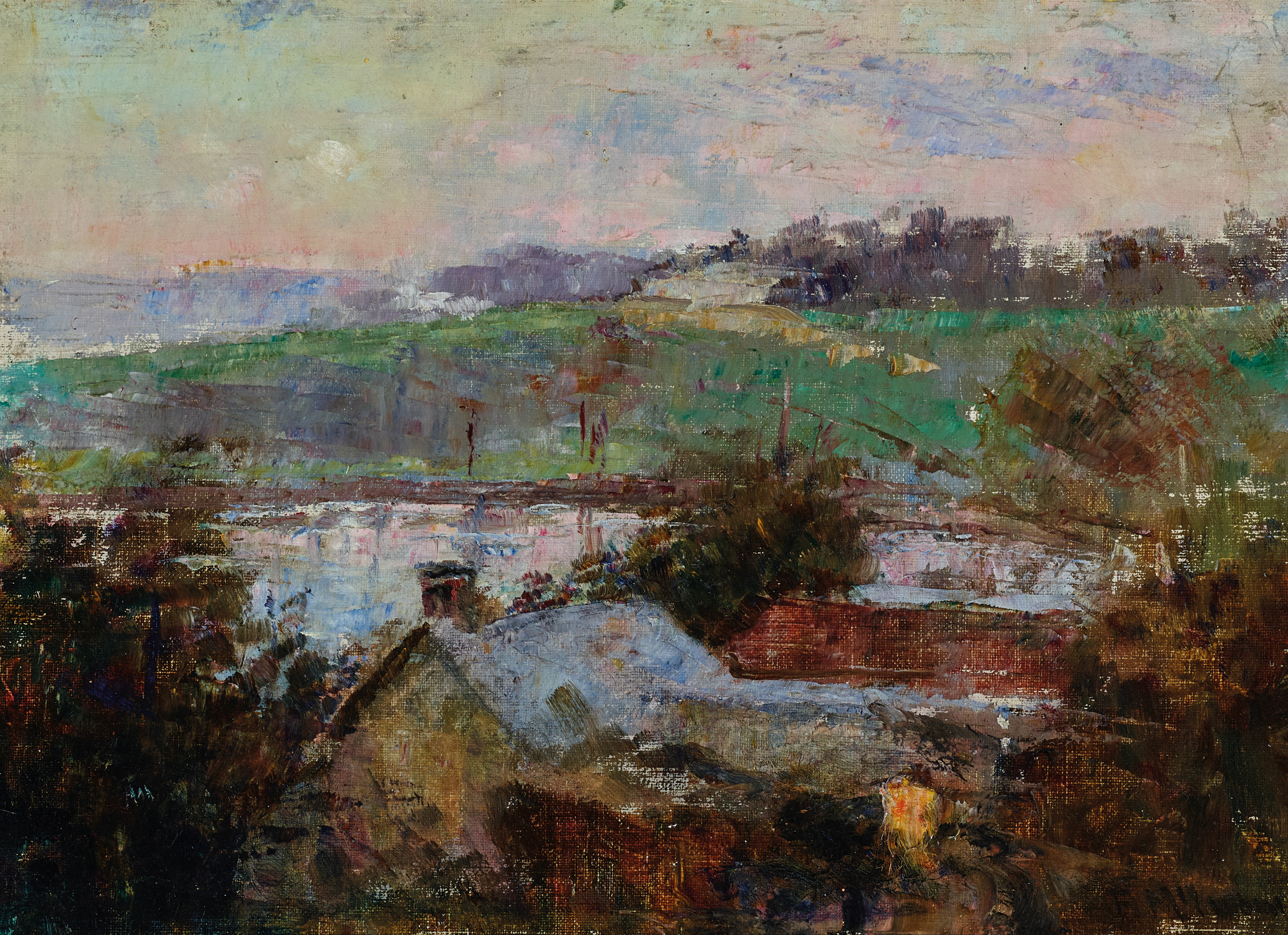Having just returned from his first and only trip to England and the Continent, McCubbin’s practice was characterised by a lighter palette and a much looser application of paint, reflecting the liberating, painterly influence of his artistic mentor Romanticist J. M. W. Turner, as well as Corot, Monet and his English contemporary, George Clausen. That influence can be seen in these wonderfully atmospheric paintings such as the present Kensington Road, South Yarra, c.1908 which, each in their different ways dazzlingly colourful masterpieces, capture the feelings he expressed in a letter to his old friend Tom Roberts: ‘This is the loveliest place I have ever lived in. A charming old colonial house’ perched right over the Yarra with three acres of garden and trees... The winding stream, gums, osiers and wattle; interspersed. The night effects; sunrise, moonrise, we can see every way.’1 The old garden led to a paddock, which ran down to the Misses Armytage’s Como estate. The views over the Yarra were spectacular, whether towards Richmond as in The Coming of Spring, 1912, or the even more panoramic Flood Waters (also known as Rainbow over the Yarra), 1913 – both in the collection of the National Gallery of Australia, Canberra. A rainbow sometimes appeared in these later South Yarra views, a phenomenon of beauty and a metaphor of harmony. They had their genesis in numerous smaller sketches, spontaneous responses captured with a breadth of technique that gives them their special feeling of freedom and atmospheric delight.