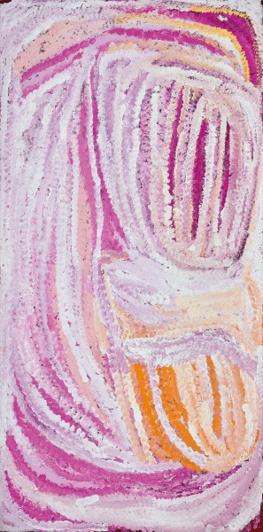 'Eubena has painted some of her country south west of Balgo along the middle stretches of the Canning Stock Route. The majority of the painting shows the tali (sandhills) that dominate this country. The central circle is Tjurrnu (soakwater) named Midjul. This is the country where Kinyu the spirit dog lives. Eubena would often cover Midjul with leaves so Kinyu wouldn't come out and would also leave gifts of goanna for Kinyu.'