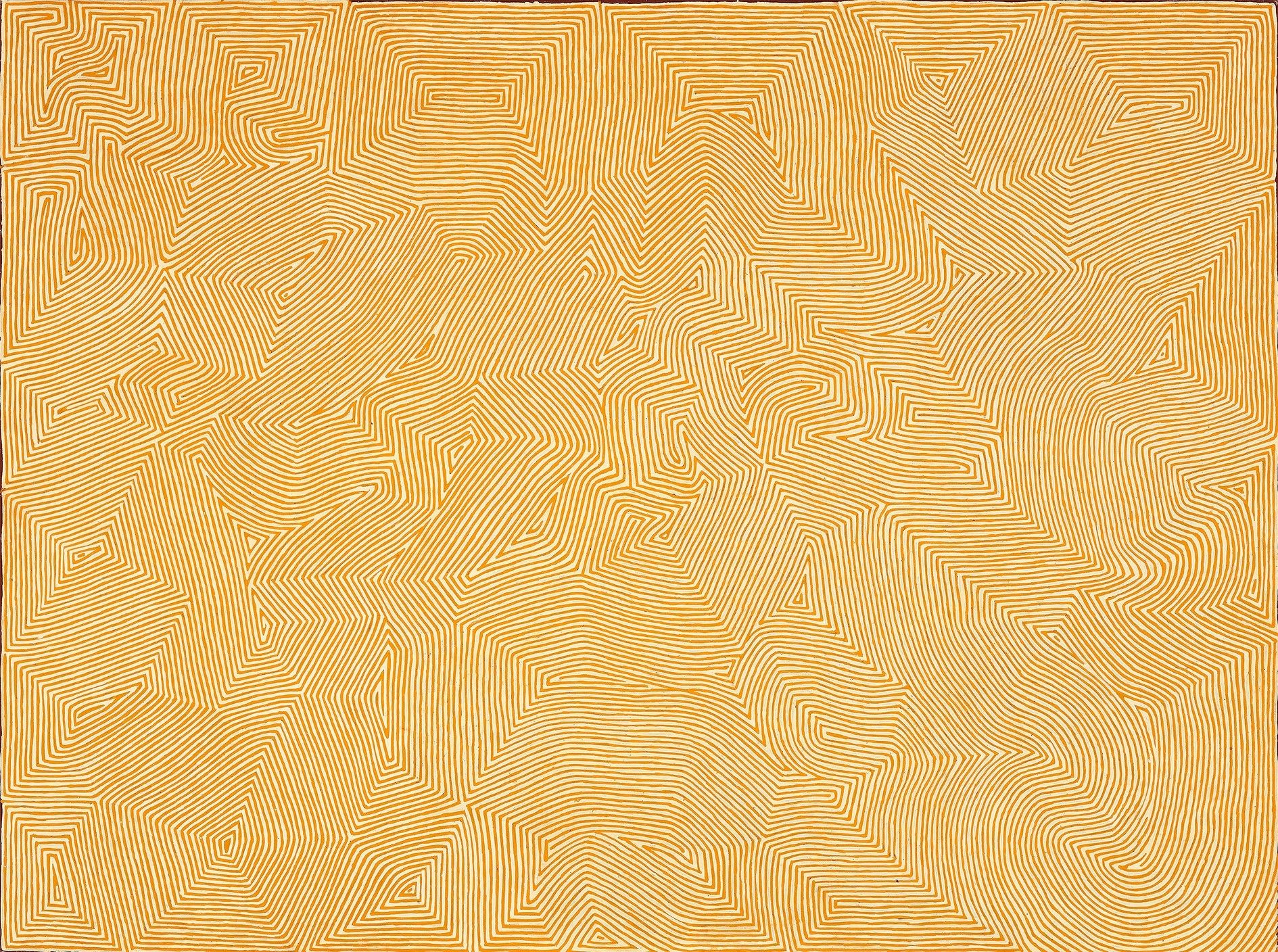 This painting is accompanied by a certificate from Papunya Tula Artists that states in part: ‘The design in this painting depicts the claypan site of Kirrimalunya, north of Wilkinkarra (Lake Mackay). In ancestral times two Ngangkari (Aboriginal healers) were camped at this site. The two were only young boys, but often this healing power is given to Ngangkaris by the time they are young teenagers. This ancestral story forms part of the Tingari Cycle [...].These ancestral stories form part of the teachings of the post initiatory youths today as well as providing explanations for contemporary customs.’