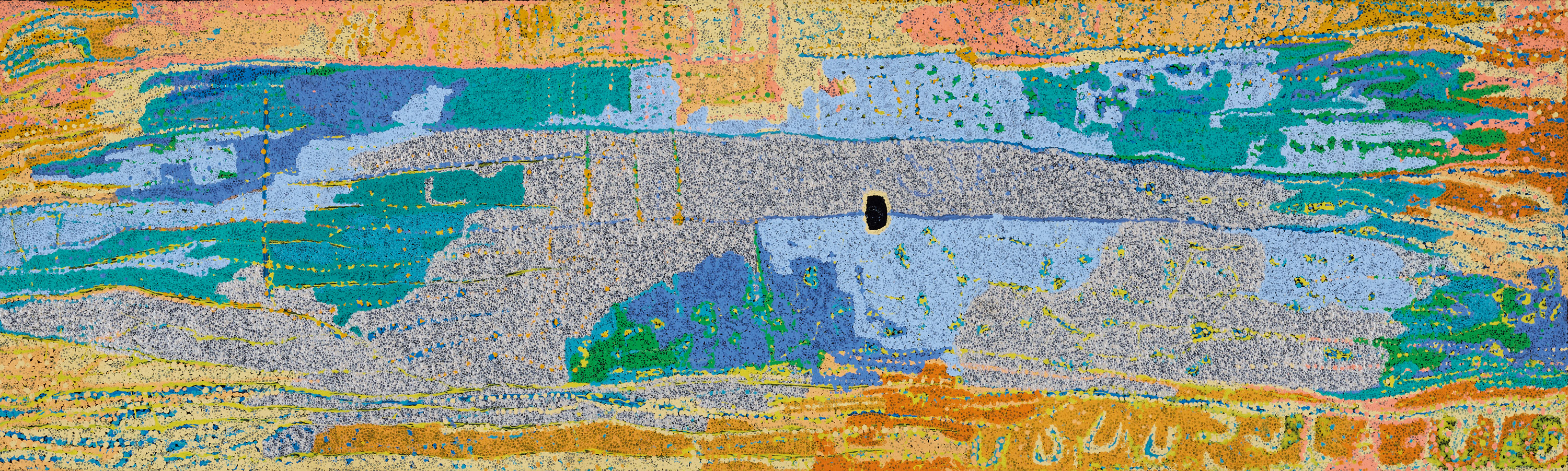 Having spent his entire life living in the coastal town of Bidyadanga in north-west Western Australia, Daniel Walbidi’s Kirriwirri, 2007 is a personal exploration of the artist’s heritage from afar. The painting documents a place he had never visited before 2007 yet had imagined, having grown up listening to the Dreaming stories from this unknown and foreign place. Kirriwirri, located in the Great Sandy Desert close to Well 33 on the Canning Stock Route, was the traditional country of Walbidi's parents, grandparents and home to other clan and family groups. During the 1960s after a severe and widespread drought dramatically affected their desert country, drying up lakes and rock pools completely, they were forced to migrate from their homeland to Bidyadanga or La Grange Mission, a coastal community south of Broome.