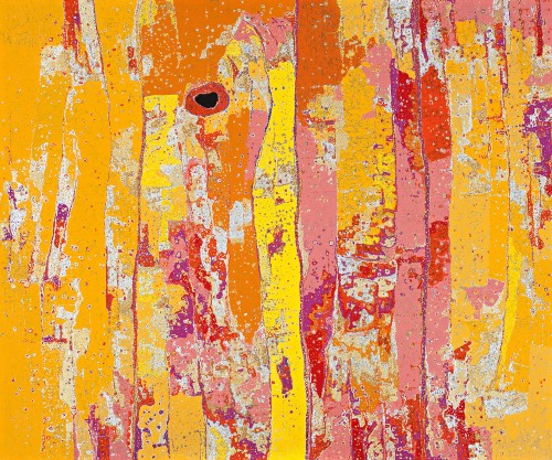 Kirriwirri has a profound personal connection for the artist; it is Walbidi’s paternal grandparents’ country, where his father was born and raised. Kirriwirri also lies near Kunawarritji, Well 33 on the Canning Stock Route, nearby the birthplace of Rover Thomas. The site features a large claypan and salt lakes (the white areas in the painting), living jila (permanent freshwater springs) and tali or sandhills. Accordingly, this chromatically scintillating painting may be considered as a yearning to visit Kirriwirri, which at the time it was created, Walbidi had not done. The work reflects the subject of much Yulparija art, the depiction of now distant lands that were once inhabited and remain ‘home’. This approach to art is reminiscent of that of the very first painters at Papunya in 1971 who were inspired by the ancestral lands from which they had been removed.